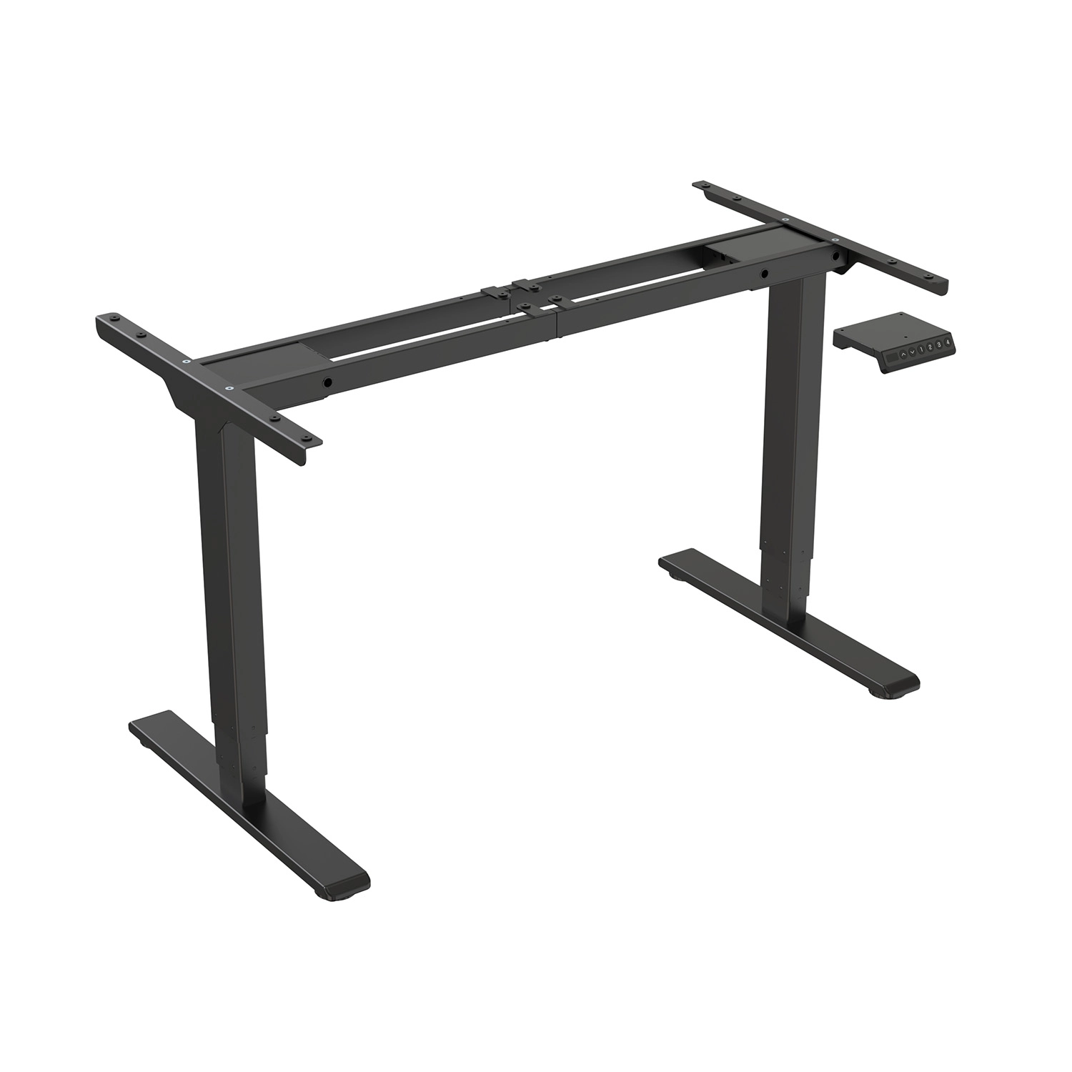 Das elektrische Tischgestell ist mit einer Steuerung mit Funktionen ausgestattet. Stellen Sie die Höhe mit den Tasten "auf" und "ab" ein und beobachten Sie die aktuelle Position auf der LED-Anzeige. Speichern Sie die gewählte Position und kehren Sie in Zukunft zu ihr zurück, indem Sie eine der vier programmierbaren Höhenspeichertasten drücken.