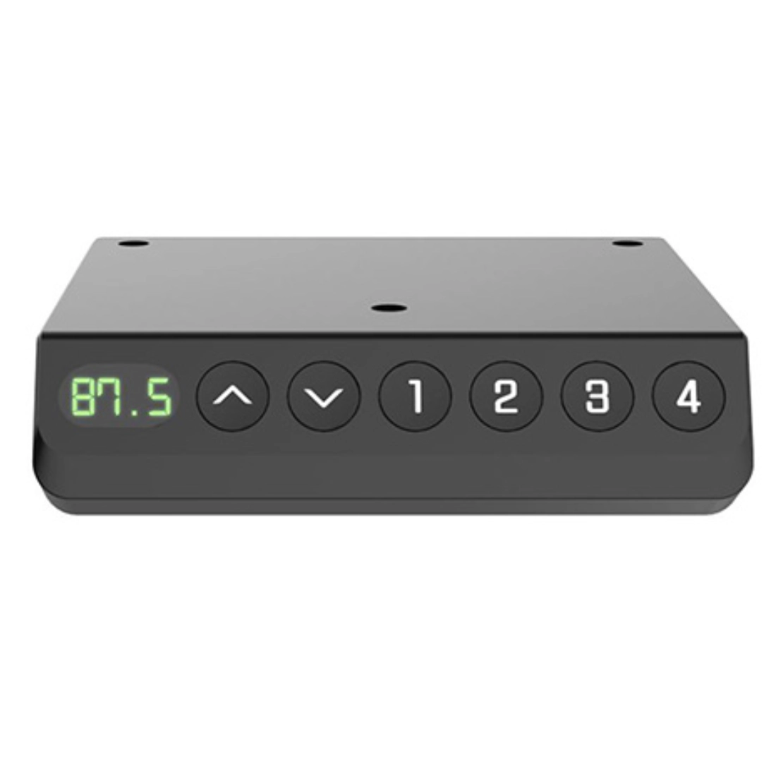 Das elektrische Tischgestell ist mit einer Steuerung mit Funktionen ausgestattet. Stellen Sie die Höhe mit den Tasten "auf" und "ab" ein und beobachten Sie die aktuelle Position auf der LED-Anzeige. Speichern Sie die gewählte Position und kehren Sie in Zukunft zu ihr zurück, indem Sie eine der vier programmierbaren Höhenspeichertasten drücken.