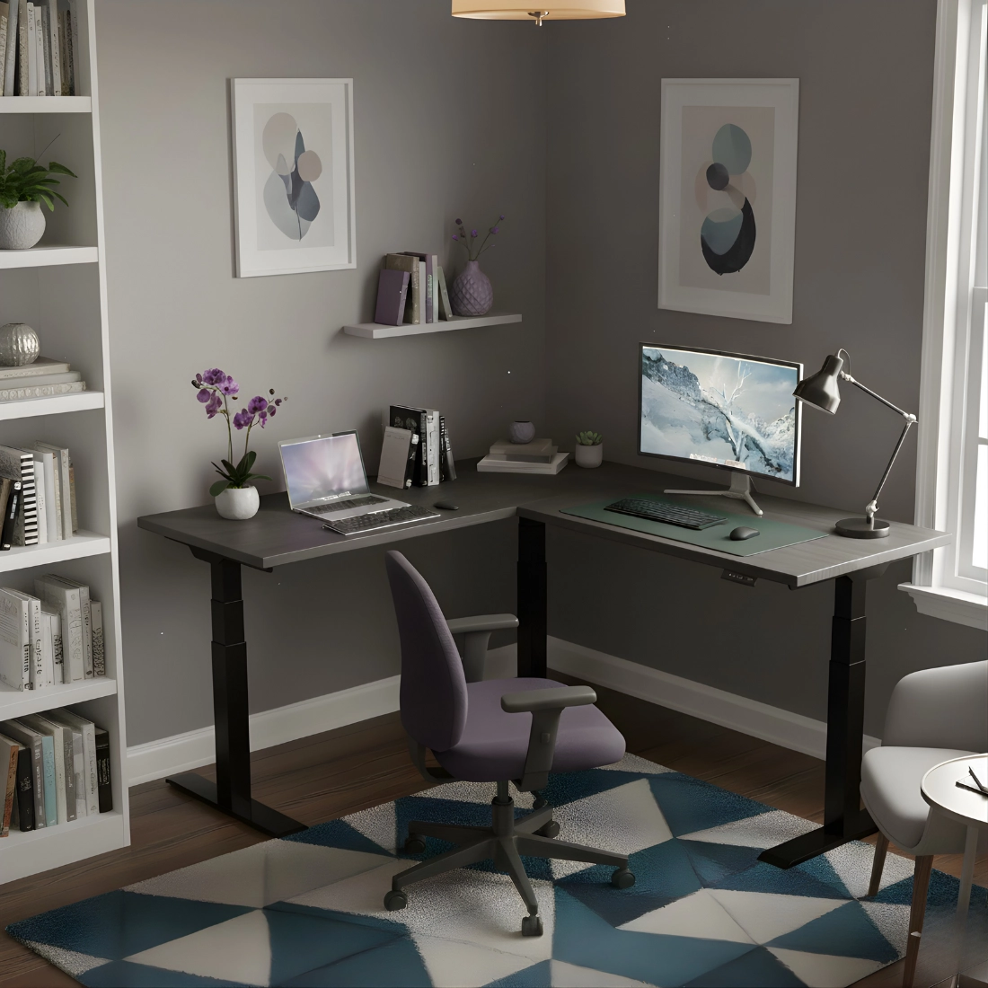 Ein einzigartiges Tischgestell, das es Ihnen ermöglicht, den Tisch Ihren Bedürfnissen entsprechend einzustellen. Sie können ihn in L-Form (Eckschreibtisch), in V-Form oder in I-Form (Standard) aufstellen. Er ist ideal für größere Schreibtische, da er eine große Arbeitsfläche bietet.