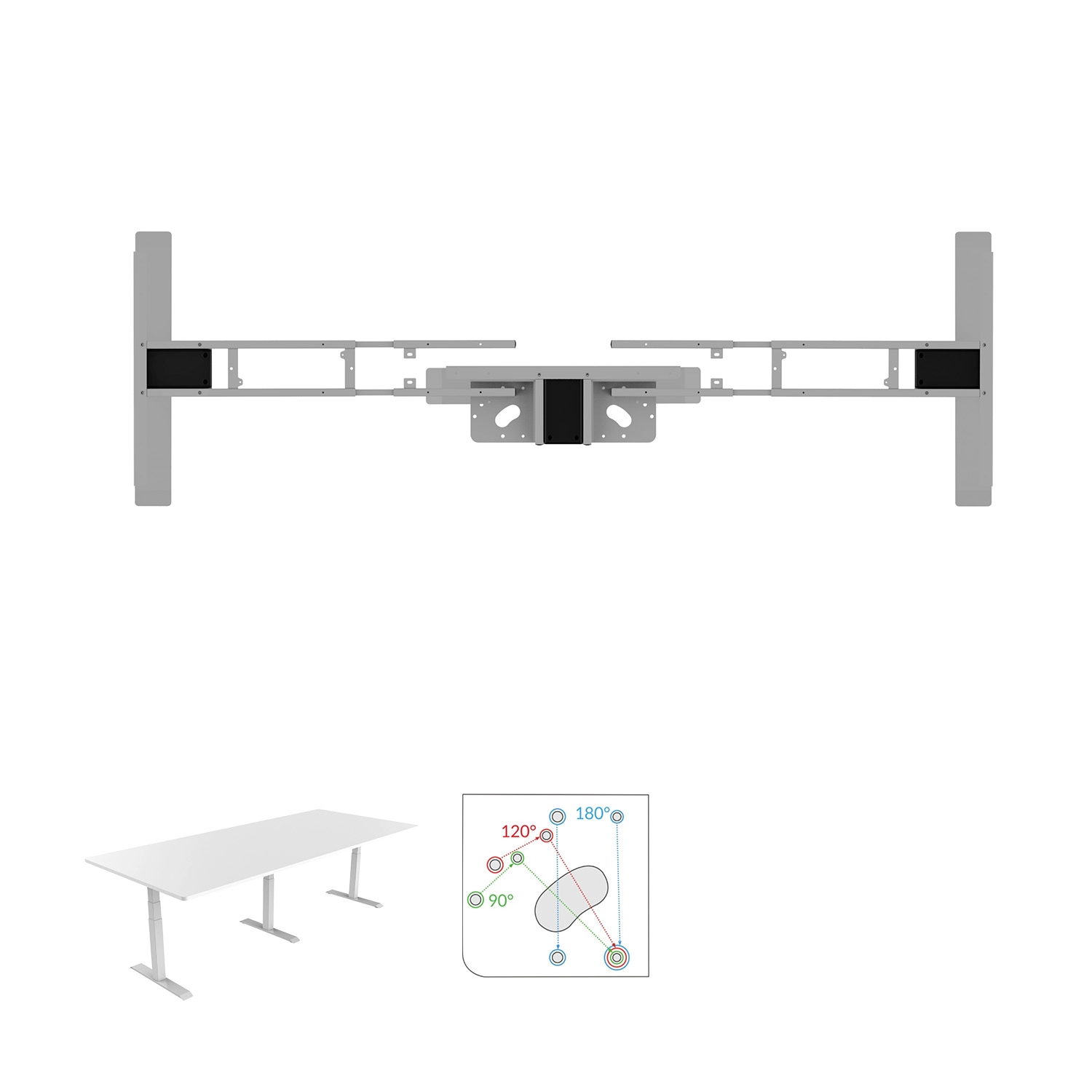 Das vielseitige Gestell des elektrischen Gestells ermöglicht nicht nur die Verstellung nach oben/unten und die Umstellung auf drei Varianten, sondern auch die doppelte manuelle horizontale (seitliche) Verstellung. Sie können die Struktur ganz einfach an die Größe Ihrer Tischplatte anpassen. Empfohlene Abmessungen der Tischplatte: für 90° 1300 - 1900 mm (2 Seiten), 600 - 800 mm; für 120° 1100 - 1800 mm, 600 - 800 mm; für 180° 1700 - 2900 mm, 600 - 1000 mm.