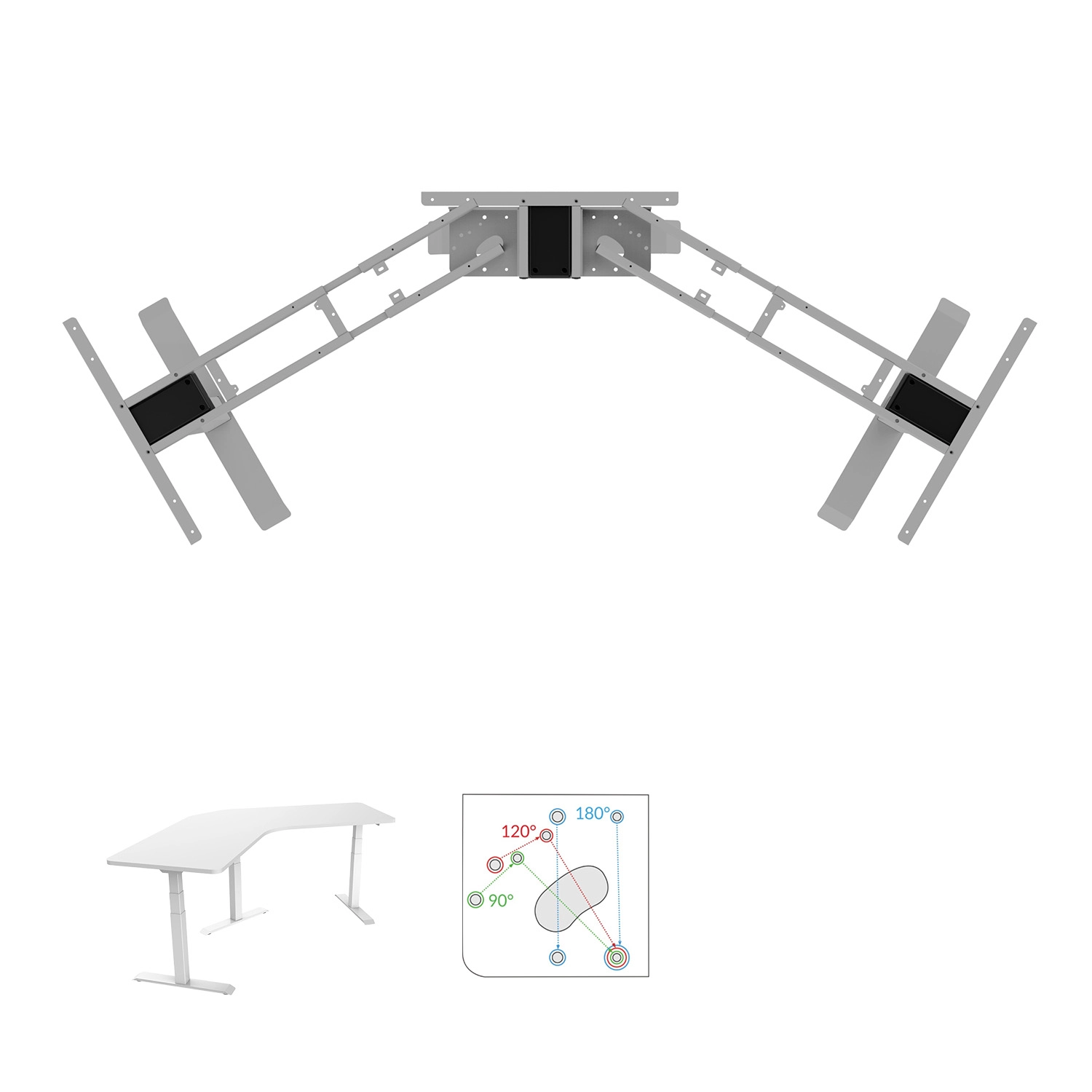 Ein einzigartiges Tischgestell, das es Ihnen ermöglicht, den Tisch Ihren Bedürfnissen entsprechend einzustellen. Stellen Sie ihn in L-Form (Eckschreibtisch), in V-Form oder in I-Form (Standard) auf. Er ist ideal für größere Schreibtische, da er eine große Arbeitsfläche bietet.
