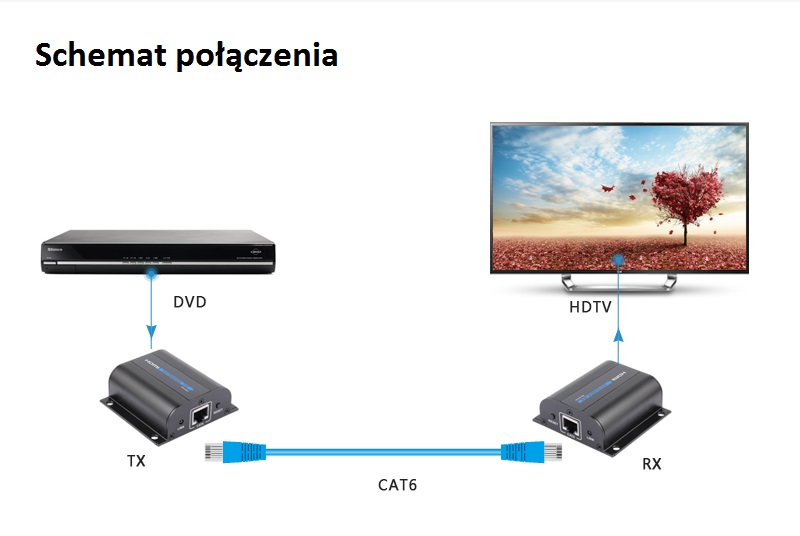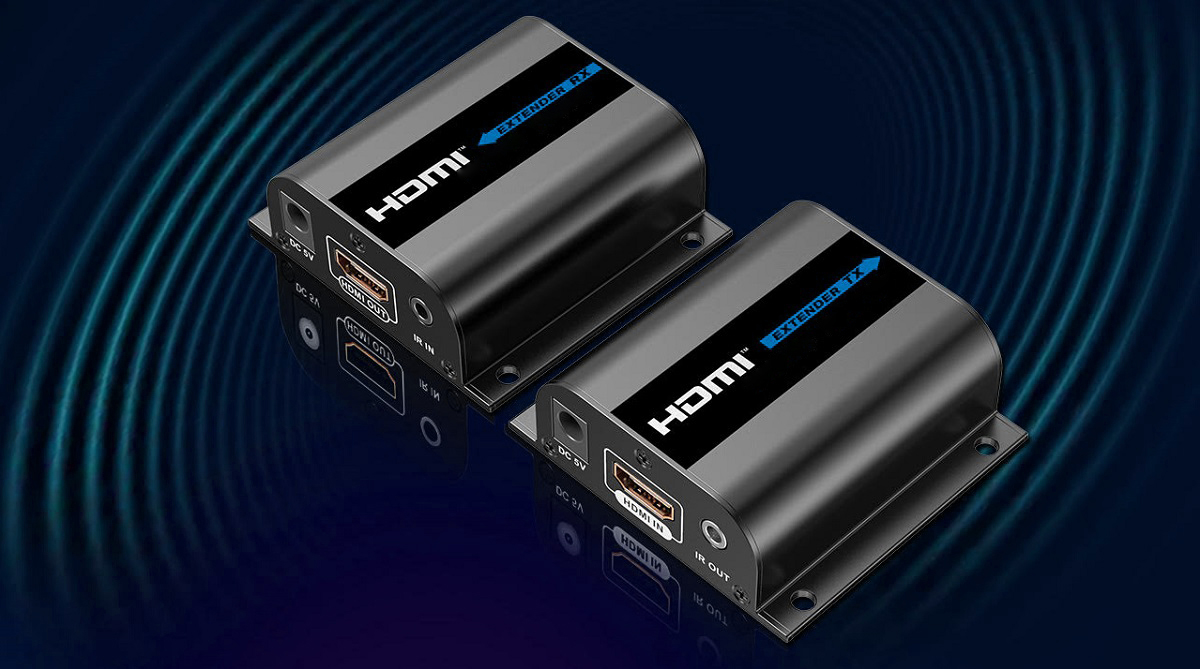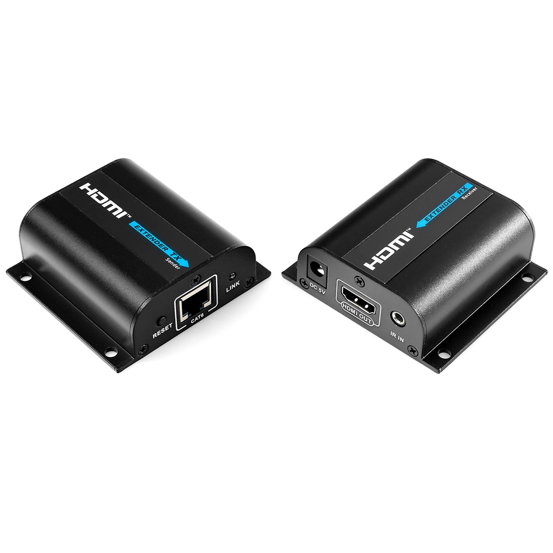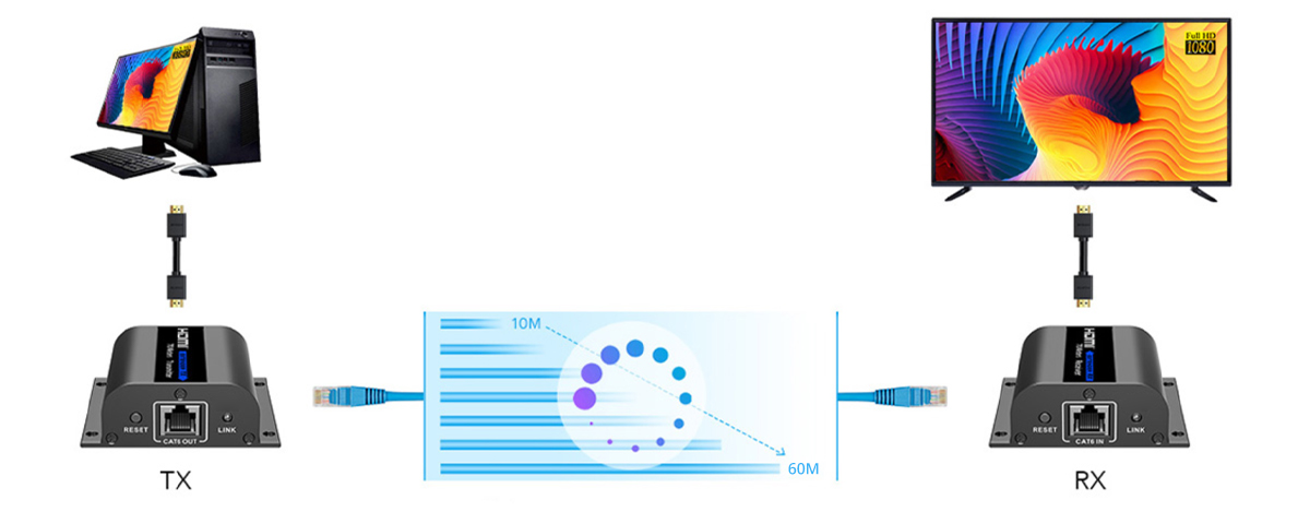 Spacetronik SPH-HLC6IRHDMI-Signalverlängerer . Das Gerät ermöglicht den Anschluss eines hochauflösenden (HD) Signals an einen Empfänger (TV, Monitor usw.), der mit einem HDMI-Anschluss ausgestattet ist, über ein CAT6- oder höherwertiges Twisted-Pair-Kabel. Das Set besteht aus einem Sender (TX) und einem Empfänger (RX). Ein weiterer Vorteil des Geräts ist die Übertragung von Fernbedienungsfunktionen über das mitgelieferte IR-Infrarot. Das Gerät überträgt ein 1080p HDMI-Signal über eine Entfernung von 60 Metern