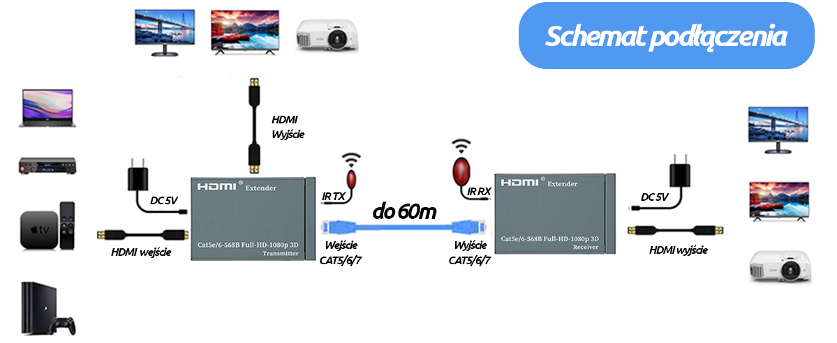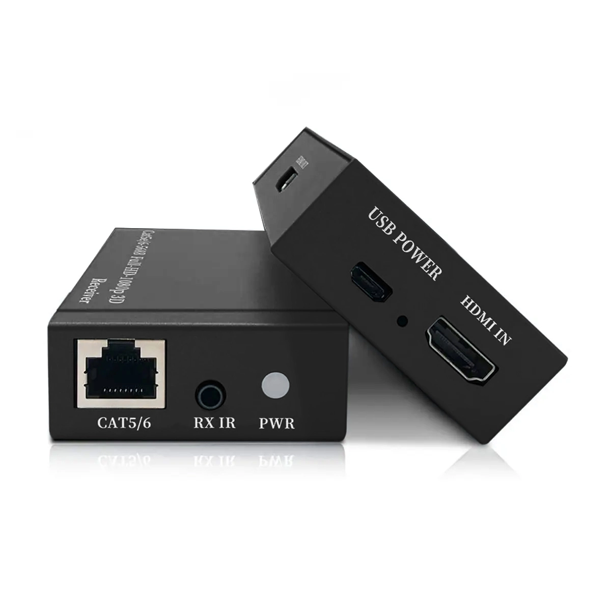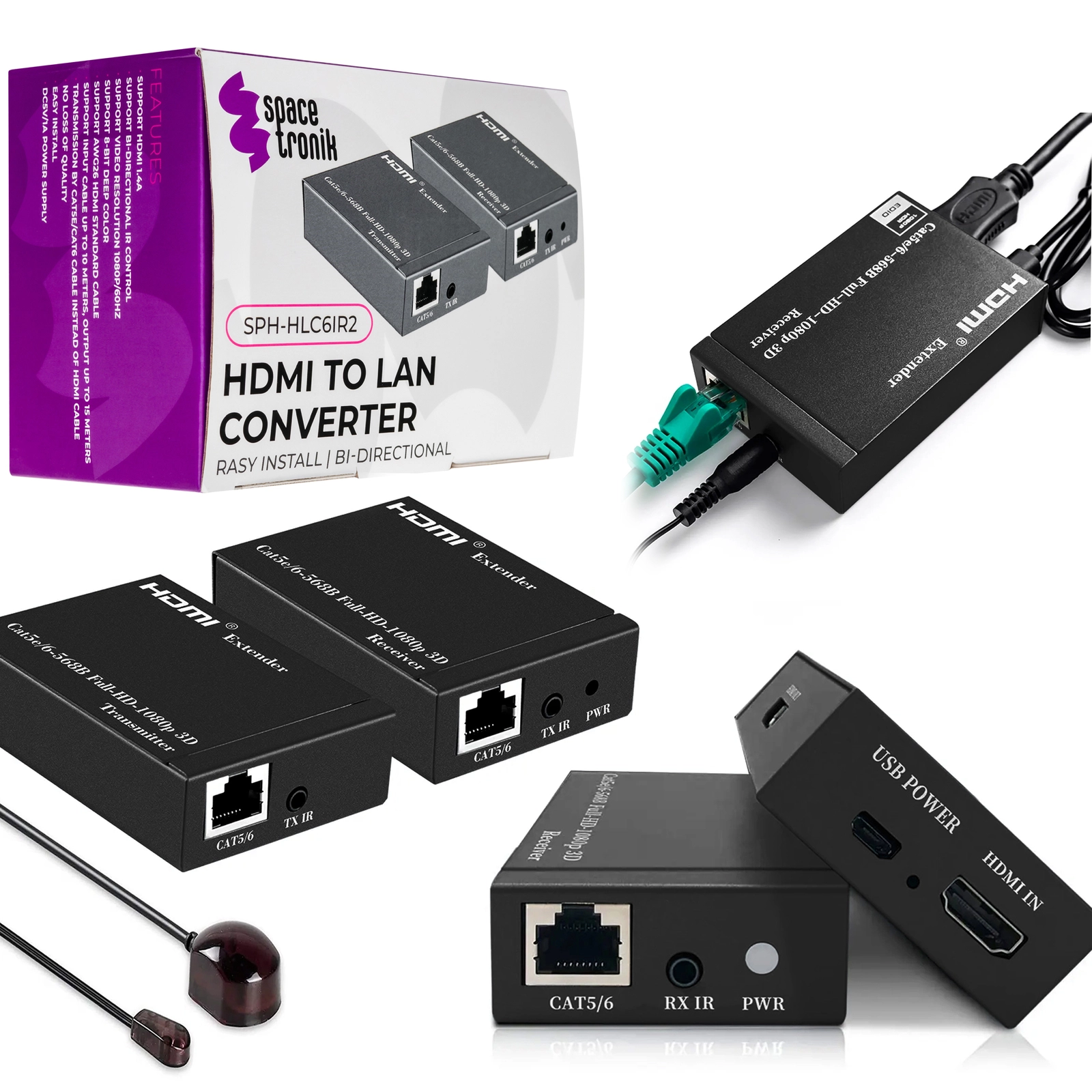 Spacetronik SPH-HLC6IR2HDMI Signal Extender . Das Gerät ermöglicht den Anschluss eines High-Definition (HD) Signals an einen Empfänger (TV, Monitor, etc.), der mit einem HDMI-Anschluss ausgestattet ist, über ein CAT6 oder höheres Twisted-Pair-Kabel. Das Set besteht aus einem Sender (TX) und einem Empfänger (RX). Ein zusätzlicher Vorteil des Geräts ist die Übertragung von Fernbedienungsfunktionen mit Hilfe der mitgelieferten Infrarotlampen (IR).