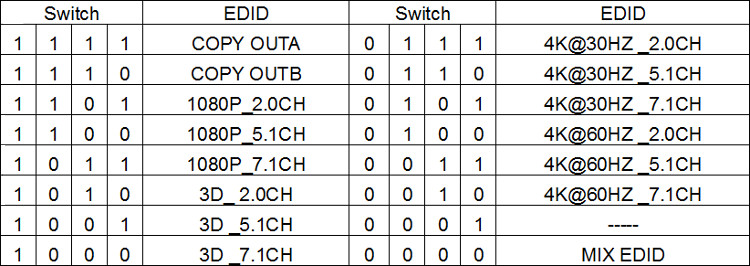 Verteilt das Signal durch Analyse der EDID-Informationen der angeschlossenen TV-Geräte / Monitore, um die von allen Geräten unterstützte Auflösung / Farbtiefe auszuwählen. Anschließend meldet er diese Daten an das Wiedergabegerät. Wenn beispielsweise ein 4K-Monitor, ein 3D-Monitor und ein herkömmlicher Full-HD-Monitor angeschlossen sind, teilt das Gerät dem Wiedergabegerät in Form von EDID-Informationen mit, dass ein Full-HD-Monitor vorhanden ist. Das Abspielgerät sollte nun z.B. den Film automatisch im ?normalenM Full-HD Modus abspielen (und nicht 3D oder 4K, da nicht alle Geräte diese unterstützen).