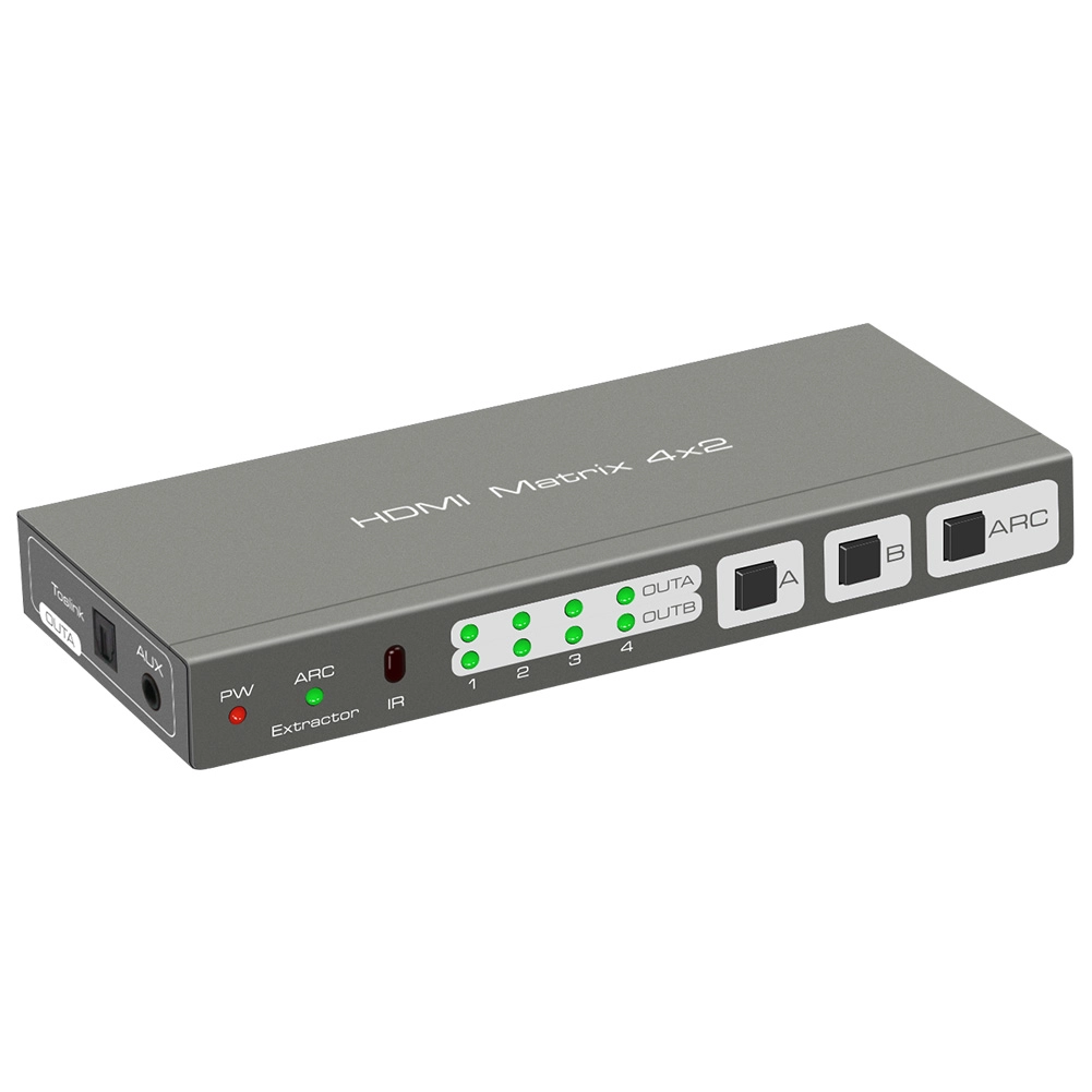 Spacetronik SPH-M42EA 4K HDMI Matrix 4/2Mit der HDMI Matrix können Sie bis zu 4 HDMI-Geräte anschließen und diese verlustfrei auf zwei HDMI-Ausgänge aufteilen. Darüber hinaus kann jeder Bildschirm je nach Auswahl unterschiedliche Bilder anzeigen. Dank der Signalverstärkung überträgt das Gerät die Bilder auch über größere Entfernungen verlustfrei. Die maximale Auflösung des übertragenen Bildes beträgt 4Kx2K @ 60Hz. Das Gerät unterstützt auch den HDMI ARC-Kanal und die Audioextraktion.