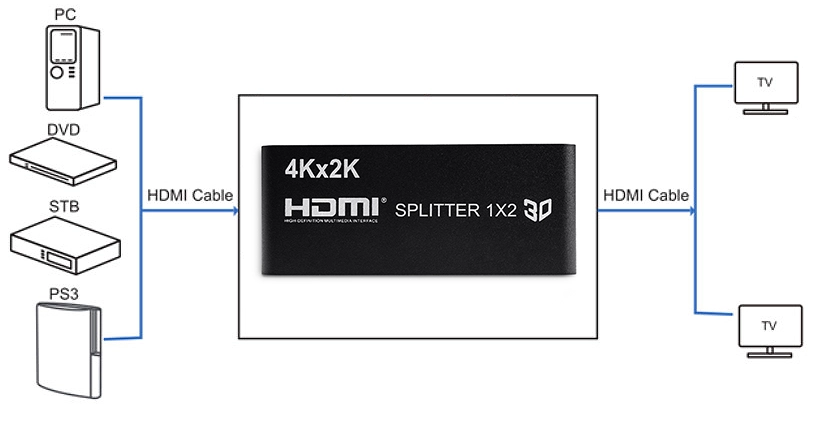 - Ein HDMI-Eingangssignal wird zwischen zwei HDMI-Geräten aufgeteilt