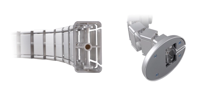 Er ist kompatibel mit allen Standard-Schreibtischen, Tischen und den meisten Schreibtischen mit elektrischer Höhenverstellung (empfohlen für Schreibtische, bei denen die untere Säule statisch ist). Die Höhenverstellung bleibt reibungslos und die Kabel sind nicht im Weg. Die Spacetronik SPK-350 Kabelorganisation hat ein geschlossenes Design, das die verlegten Kabel vollständig verdeckt. Durch die geringe Bauhöhe fügt sich die Kabelorganisation perfekt in den Arbeitsplatz ein und wird zu einem integralen Bestandteil desselben.