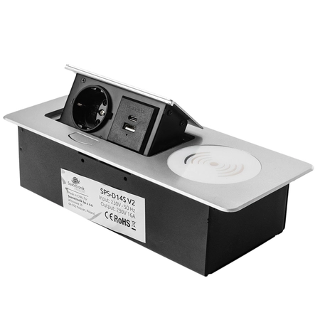 Die Spacetronik ERGOLINE SPS-D14S V2 Schaltersteckdose ist eine moderne Lösung, die in Geschäften, Ausstellungsräumen, Konferenzräumen, Büros und auch zu Hause eingesetzt wird. Ein Knopfdruck genügt und die Steckdosen öffnen sich sanft. Sie ist aus Aluminium und hochwertigen Komponenten gefertigt. Das Produkt ist für die Innenmontage in Schreibtischen, Arbeitsplatten und Tischen konzipiert, sowohl vertikal als auch horizontal, um den Zugang zu Steckdosen zu ermöglichen. Der Mediaport ist mit 1 110-250-V-Steckdose (deutscher Typ (Schuko)), einem USB-C + USB-A-Ladegerät und einem induktiven Ladegerät ausgestattet.
