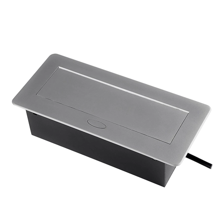• Eleganter, auf der Arbeitsplatte montierter Mediaport mit Druckknopföffnung. Mit 2 Steckdosen (Schuko) und einem doppelten USB-Ladegerät. Kabellänge 1,5 m. In Silber
