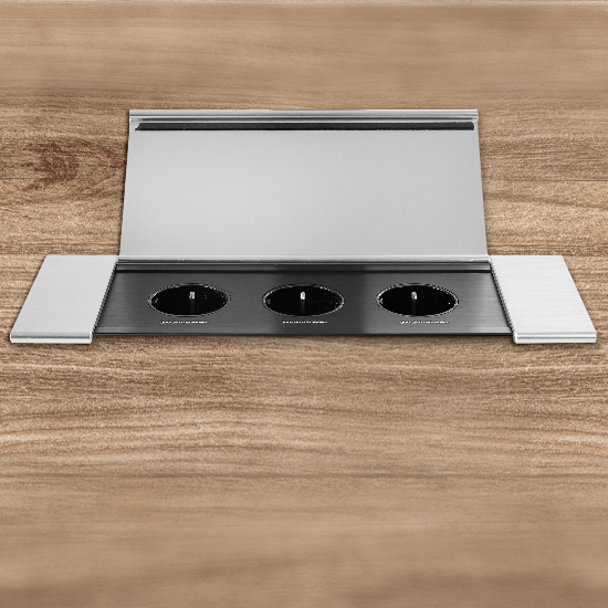 Sie suchen die perfekte Lösung, um Eleganz und Funktionalität in Ihrem Büro, Ausstellungsraum, Konferenzraum oder Zuhause zu verbinden? Die aufklappbare Möbelsteckdose von Spacetronik ist ein vielseitiges Produkt, das sich jeder Herausforderung stellt. Die drei Schuko-Steckdosen eignen sich perfekt als Steckdosenleiste auf einer Arbeitsplatte.