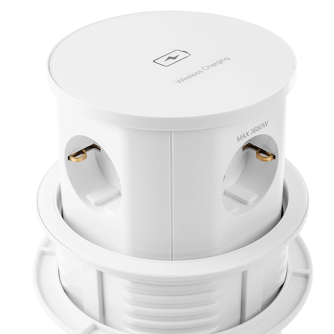 • Eleganter runder Mediaport für die Montage auf der Arbeitsplatte, gepresst. Es verfügt über 3 Steckdosen und ein duales induktives und USB-Ladegerät (USB+A + USB-C), um mindestens Ihr Smartphone aufzuladen. Kabellänge 1,7 m. In weiß.
