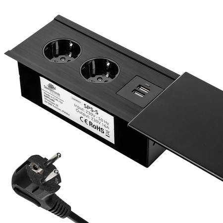 Mediaports für Spacetronik-Schreibtische Ergoline ist eine moderne Lösung, die Sie kann sowohl in Geschäften, Ausstellungsräumen, Konferenzräumen, Büros als auch zu Hause eingesetzt werden. als auch im privaten Bereich. Das Modell Spacetronik SPS-S24B V2 COMPACT ist eine kleinere Version des des Grundmodells. Der Möbelsockel ist aus Aluminium und hochwertigen hochwertigen Komponenten. Das Produkt ist für den Inneneinbau in Schreibtischen Schreibtischen, Arbeitsplatten und Tischen. Die Einbausteckdose ist mit 2 Steckdosen ausgestattet Schuko-Steckdosen 110-250 V (deutsch/no-pin) und einem Doppel-Ladegerät USB-A.