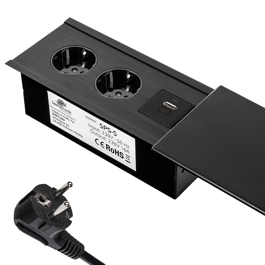 • Spacetroniks COMPACT-Version der Einschub-Möbelsteckdose zum Einbau in jede Arbeitsplatte. Ausgestattet mit zwei Schuko-Steckdosen und einem dualen USB-Ladegerät mit USB-A und USB-C Anschluss. Kabellänge 1,5 m. In schwarz.
