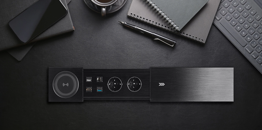 Sie suchen die perfekte Lösung, um Eleganz und Funktionalität in Ihrem Büro, Showroom, Konferenzraum oder Zuhause zu verbinden? Die ausziehbare Spacetronik-Arbeitsplattensteckdose ist ein vielseitiges Produkt, das jeder Herausforderung gewachsen ist. Mit einem modernen Design und einer Vielzahl von Anschlüssen wie USB, HDMI und Ethernet sowie einer schnellen Induktionsladefunktion bringen unsere Möbelsteckdosen Komfort und Ästhetik in jeden Arbeitsbereich.