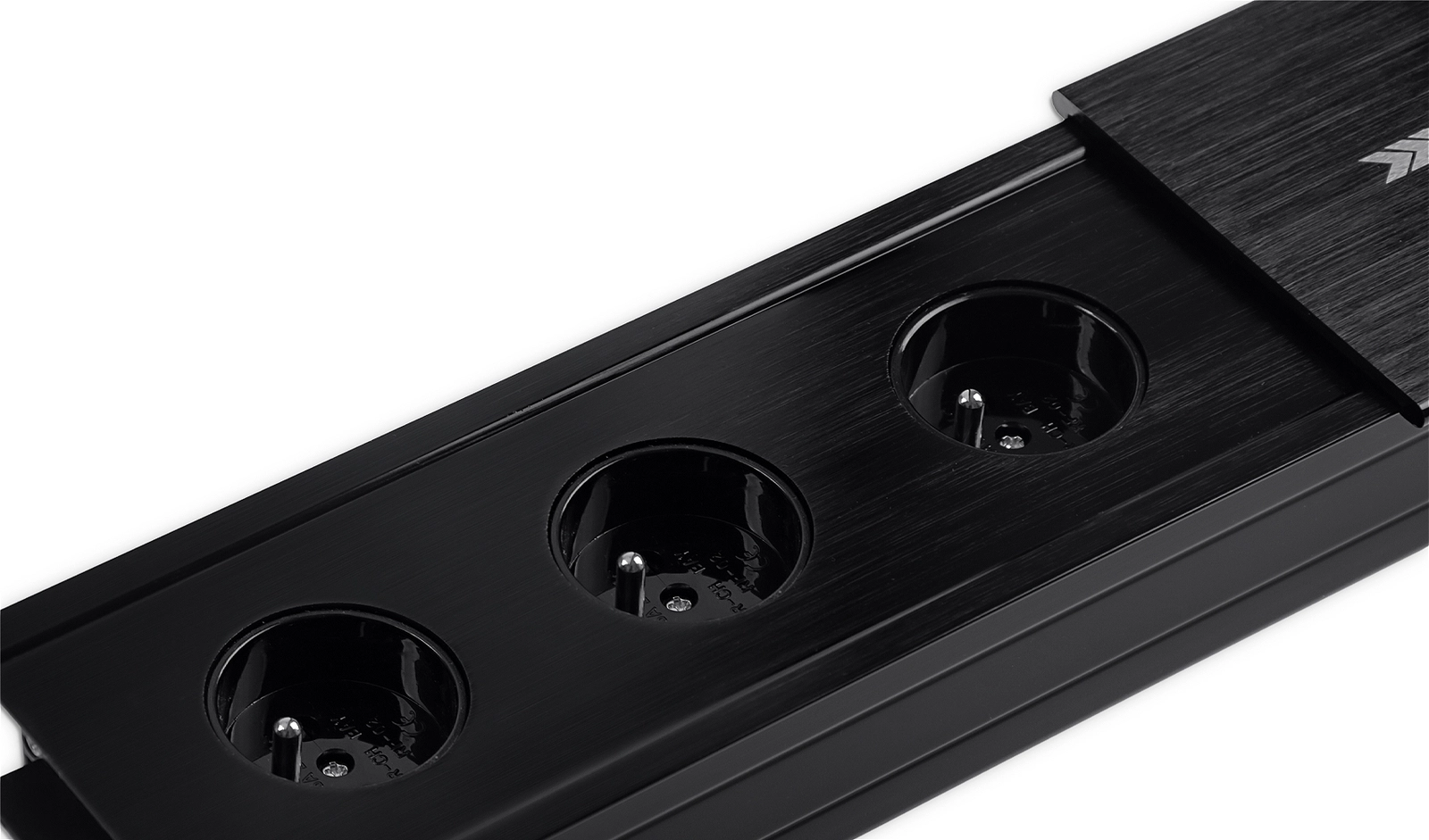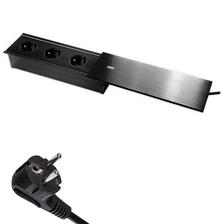 • Eleganter, auf der Arbeitsplatte montierter Mediaport zum Einschieben. Mit 3 elektrischen Steckdosen. Kabellänge 1,5 m. In Schwarz.
