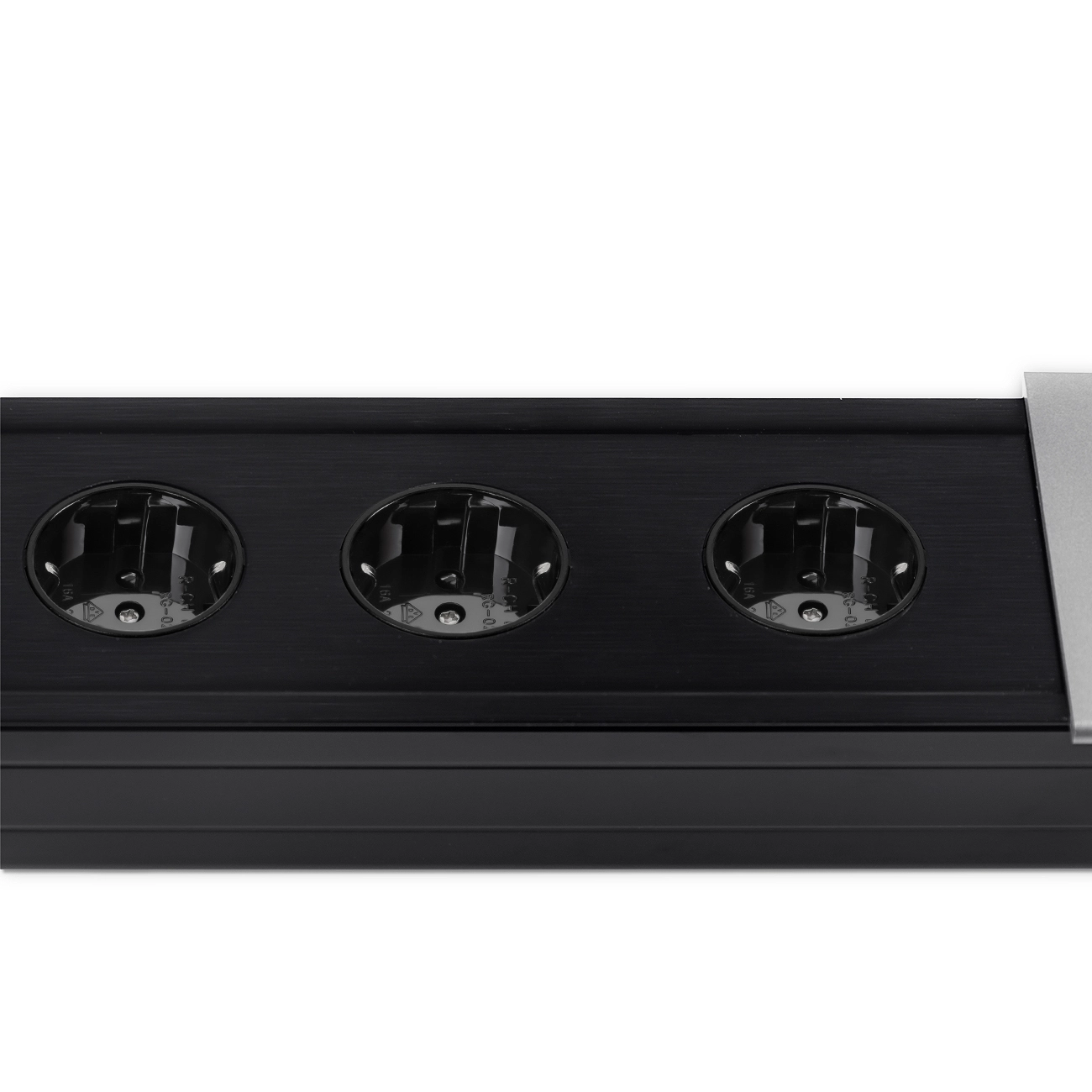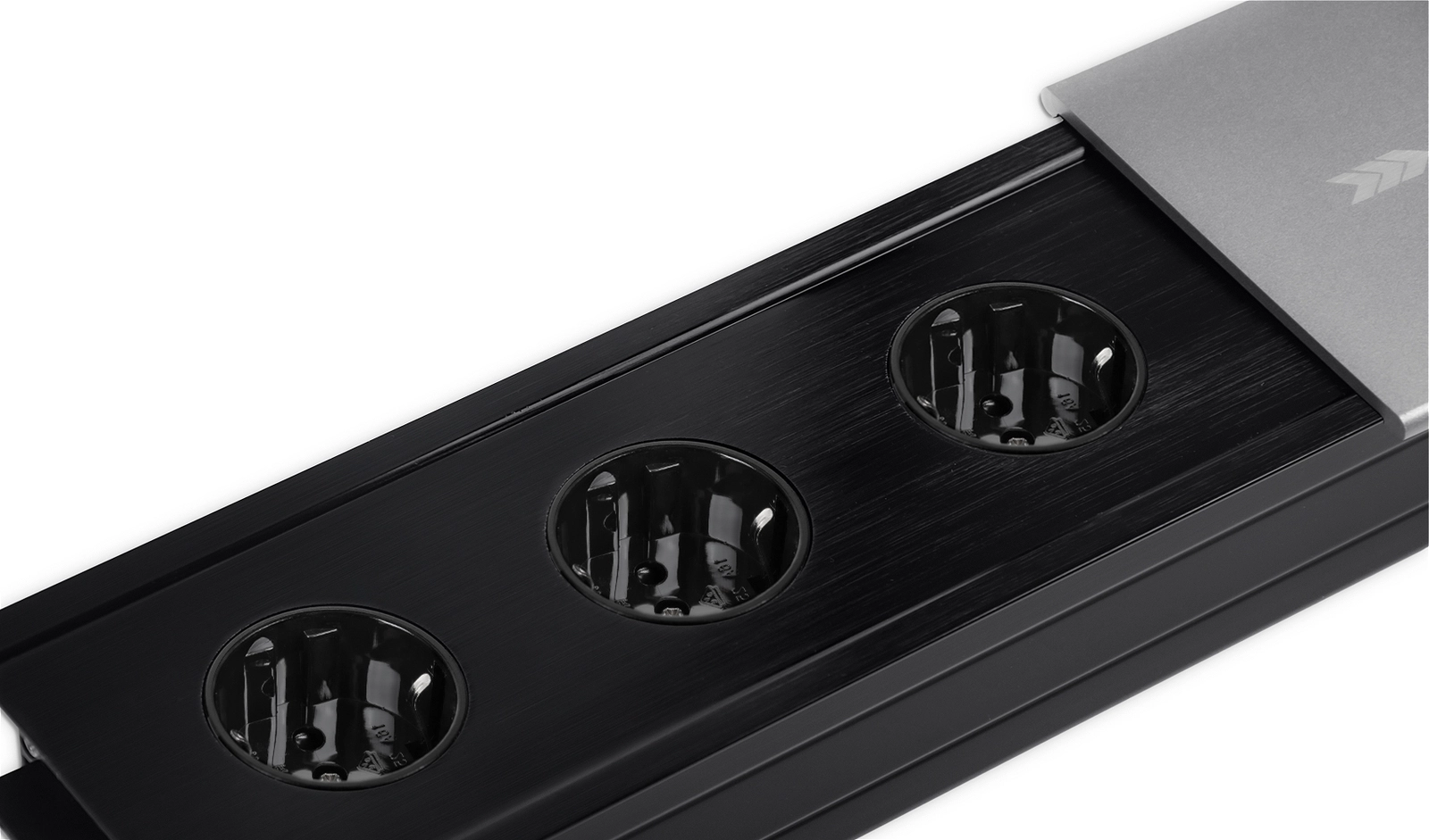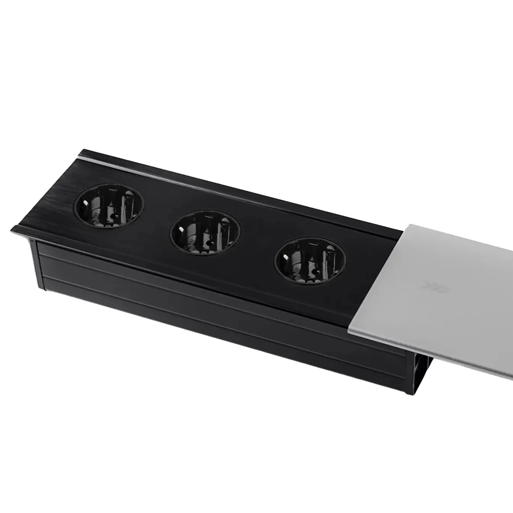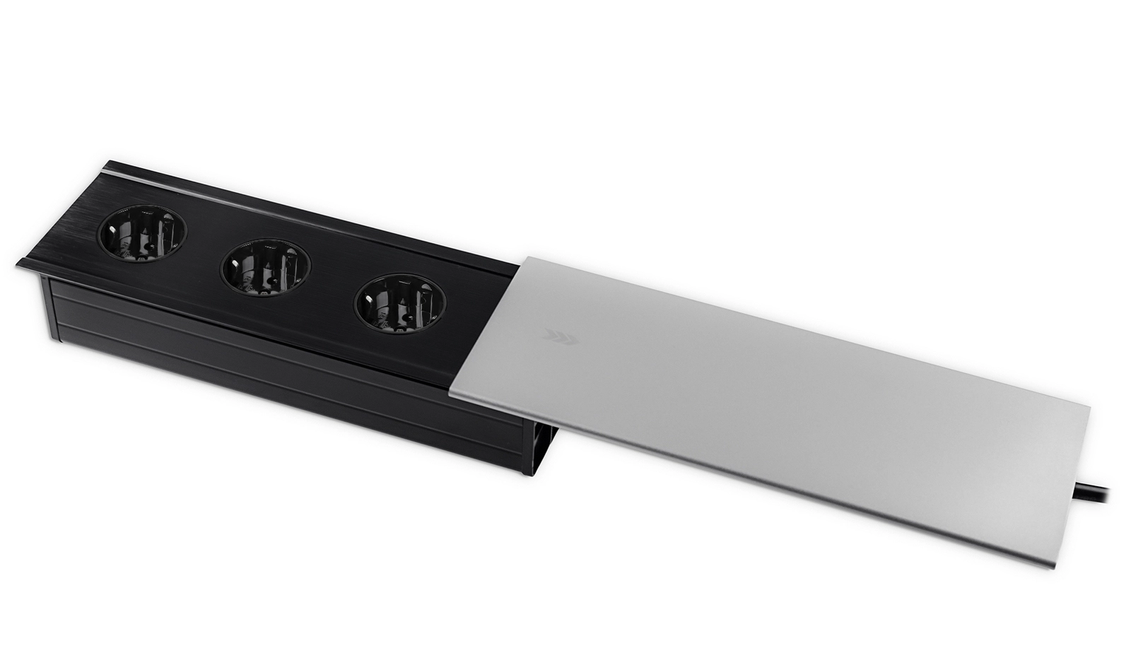 • Eleganter, auf der Arbeitsplatte montierter Mediaport zum Einschieben. Mit 3 Steckdosen (Schuko). Kabellänge 1,5 m. In Silber.