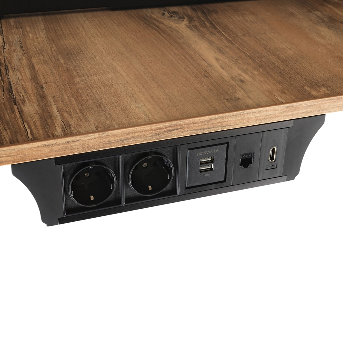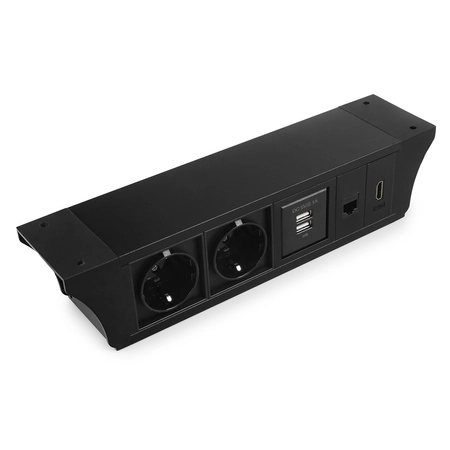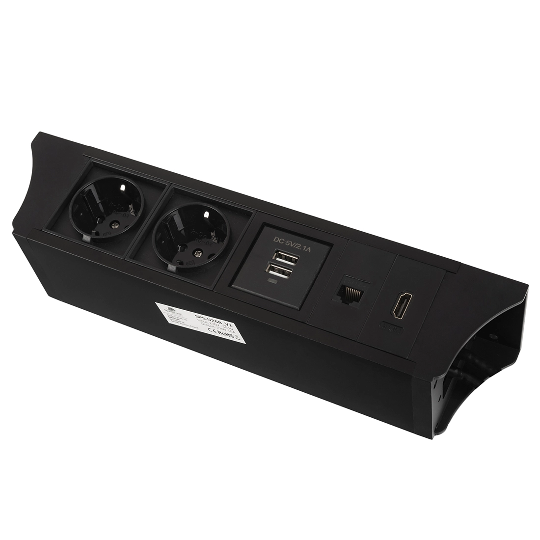 • Möbeldose für den Einbau in die Arbeitsplatte. Sie verfügt über zwei Steckdosen (Schuko), ein duales USB-Ladegerät, eine HDMI 2.0-Buchse und einen RJ-45-Anschluss. In Schwarz.