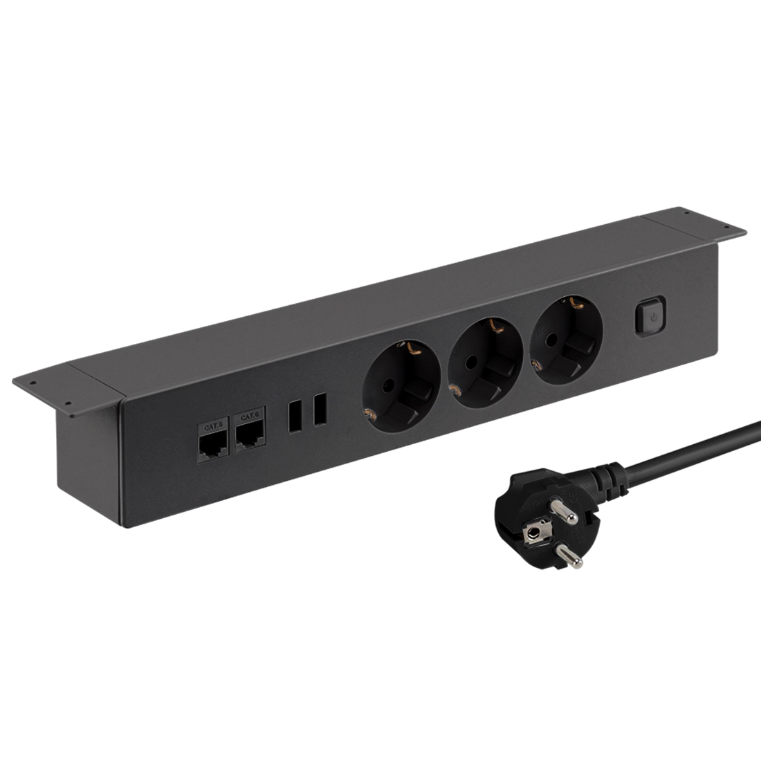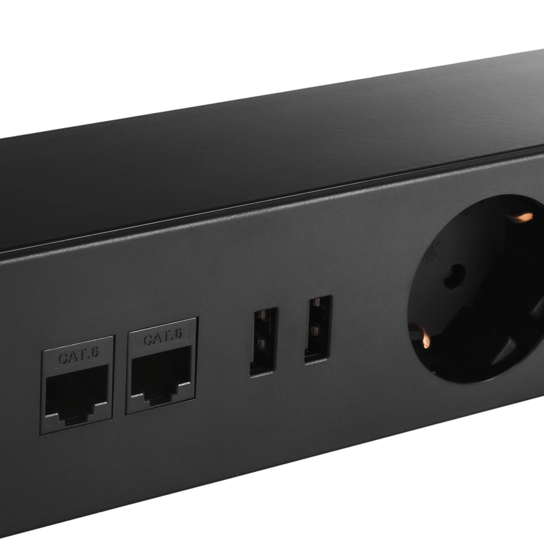 Die Spacetronik ERGOLINE Untertischverteilerleiste SPSU38B_V22 ist eine moderne Lösung, die in Geschäften, Ausstellungsräumen, Konferenzräumen, Büros und auch zu Hause eingesetzt wird. Es ist aus Aluminium und hochwertigen Komponenten gefertigt. Das Produkt ist für die Inneninstallation in Schreibtischen, Arbeitsplatten und Tischen konzipiert und ermöglicht den Zugang zu Steckdosen. Der Mediaport ist mit drei 110-250-V-Steckdosen (Schuko-Typ), einem doppelten USB-Ladegerät und zwei CAT-6 RJ45-Ethernet-Keystones ausgestattet.