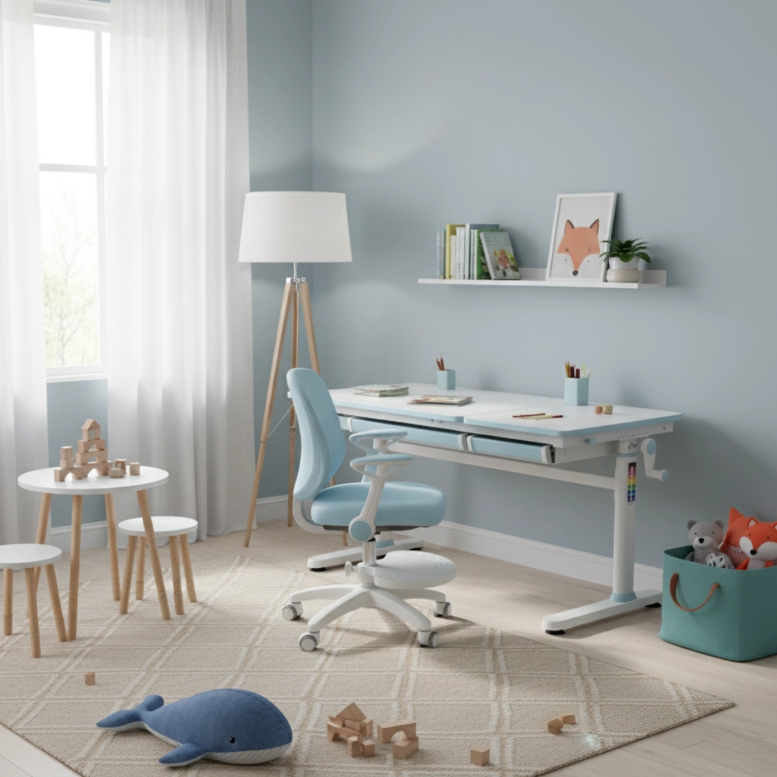 Der verstellbare Kinderschreibtisch ist mit vielen Funktionen ausgestattet, die zu Komfort und Sicherheit beitragen.