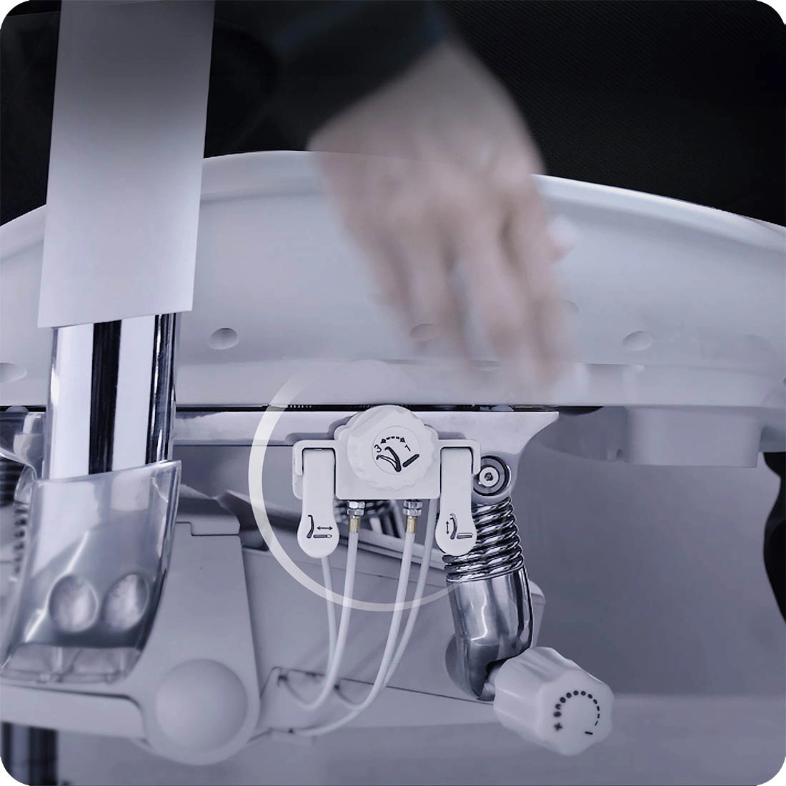 Der Bürostuhl Spacetronik SPRINGLE 66 ist mit einer fortschrittlichen dynamischen Lendenwirbelstütze ausgestattet. Sie erinnert an die Flügel eines Vogels oder eines Schmetterlings und besteht aus zwei getrennt arbeitenden Teilen. Jedes ist mit zwei elastischen Federn ausgestattet, die sich automatisch in ihrer Position anpassen. So passt sie sich an die Form Ihres Rückens an. Und wenn Sie vom Stuhl aufstehen, kehren sie in ihre natürliche Position zurück. So kann der Stuhl problemlos von mehreren Personen genutzt werden, ohne dass das Lendenkissen manuell verstellt werden muss. Das macht ihn zu einem sehr ergonomischen Produkt, das sich zum Beispiel für den Einsatz in modernen Büros eignet. Er ist auch ideal für den Einsatz im Schichtbetrieb, wenn mehrere Mitarbeiter nacheinander am selben Arbeitsplatz arbeiten. Darüber hinaus ist die Rückenlehnenmechanik mit einer Gasliftfunktion ausgestattet. Diese ermöglicht eine Feineinstellung im Lendenbereich. Durch Drehen des Knopfes, der sich an der Seite des rechten Flügels" des Mechanismus befindet, können Sie die Neigung der Rückenlehne einstellen. Sie passt sich unter Druck automatisch zwischen 90° und 105° an. So können Sie die Funktionalität Ihres Bürostuhls optimal ausnutzen.