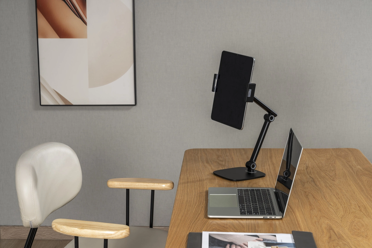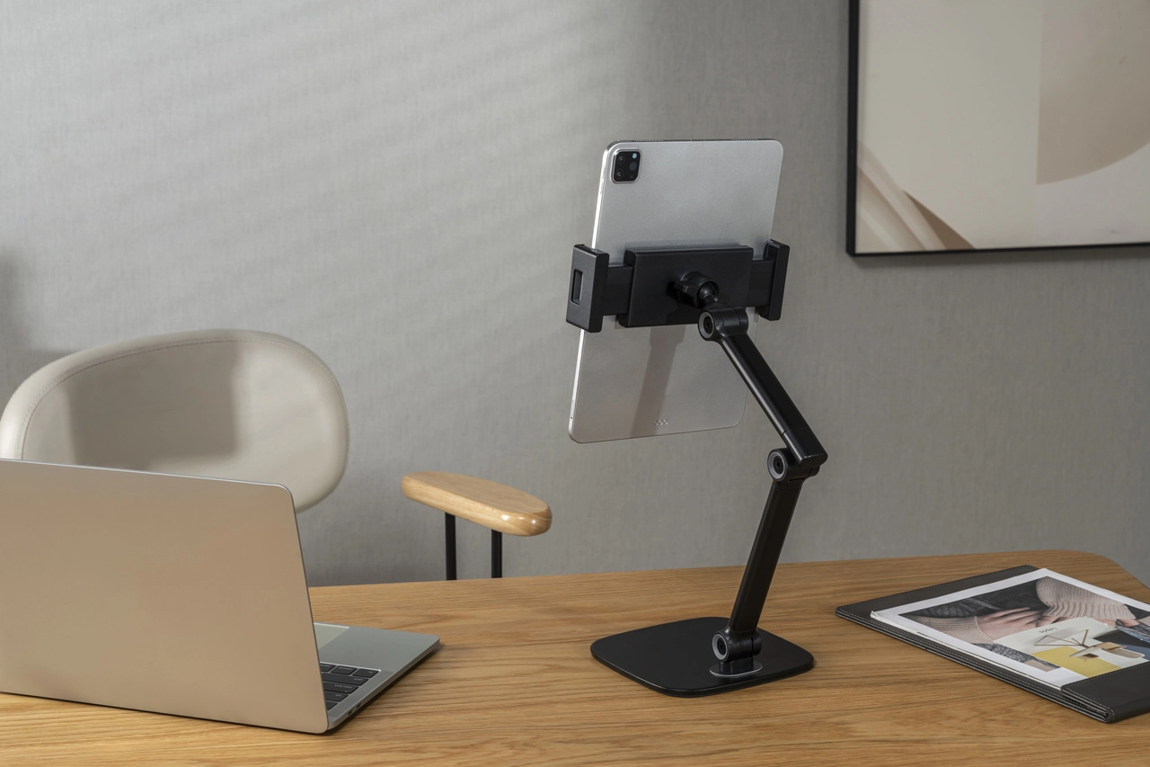 Minimalistisches Design und Funktionalität sind die Merkmale, durch die sich dieser Halter von der Konkurrenz abhebt. Der Tablet-Halter ist eine großartige Möglichkeit, Ihr Gerät sauber und ordentlich zu halten. Er ist auch ideal für Menschen mit begrenztem Stauraum.