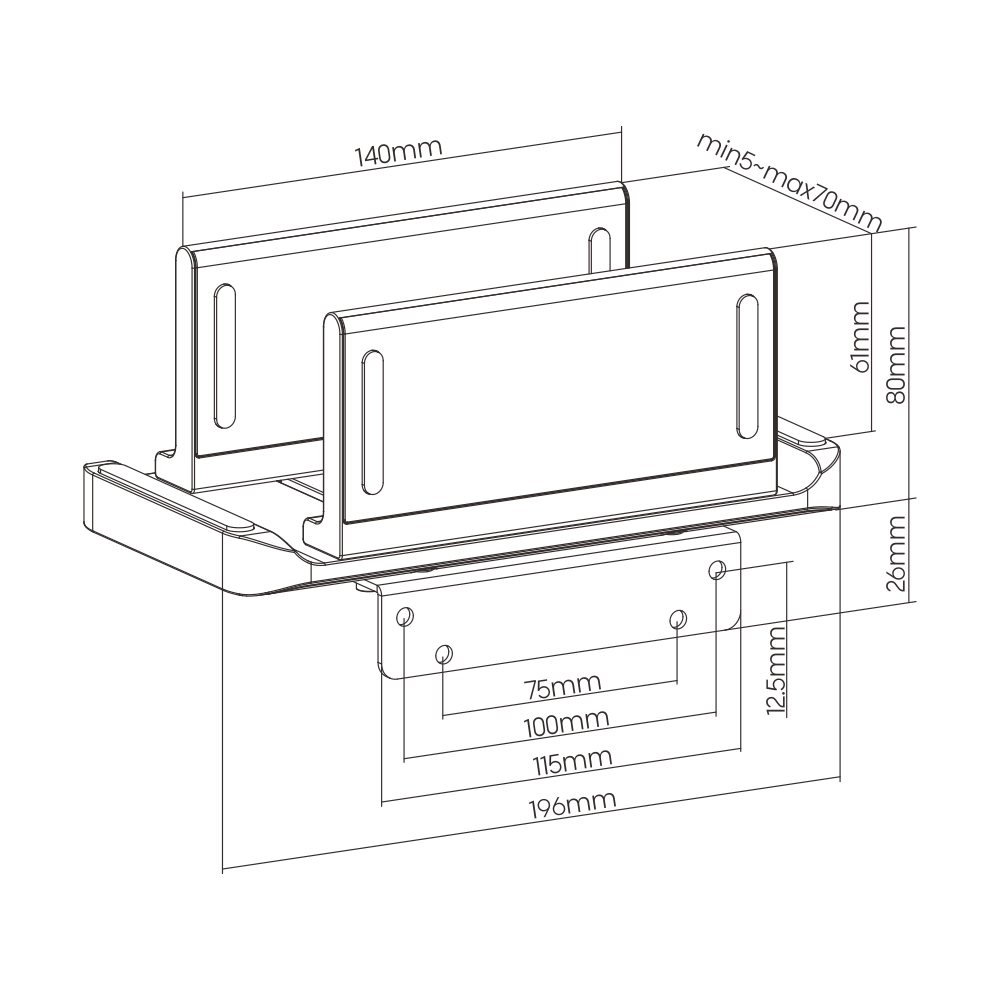 TECHNISCHE DATEN: PC Halterung aus Kunststoff hergestellt. Matte Oberflächenveredelung. Farbe: Schwarz. Abmessungen: 196x110x80mm. Passend für Geräte bis zu einer Breite von 70mm. Maximale Tragfähigkeit: 3 kg. VESA-Standard-Kompatibilität: 75x75,100x100. Installation: freistehend, verschraubt, VESA-Montage.