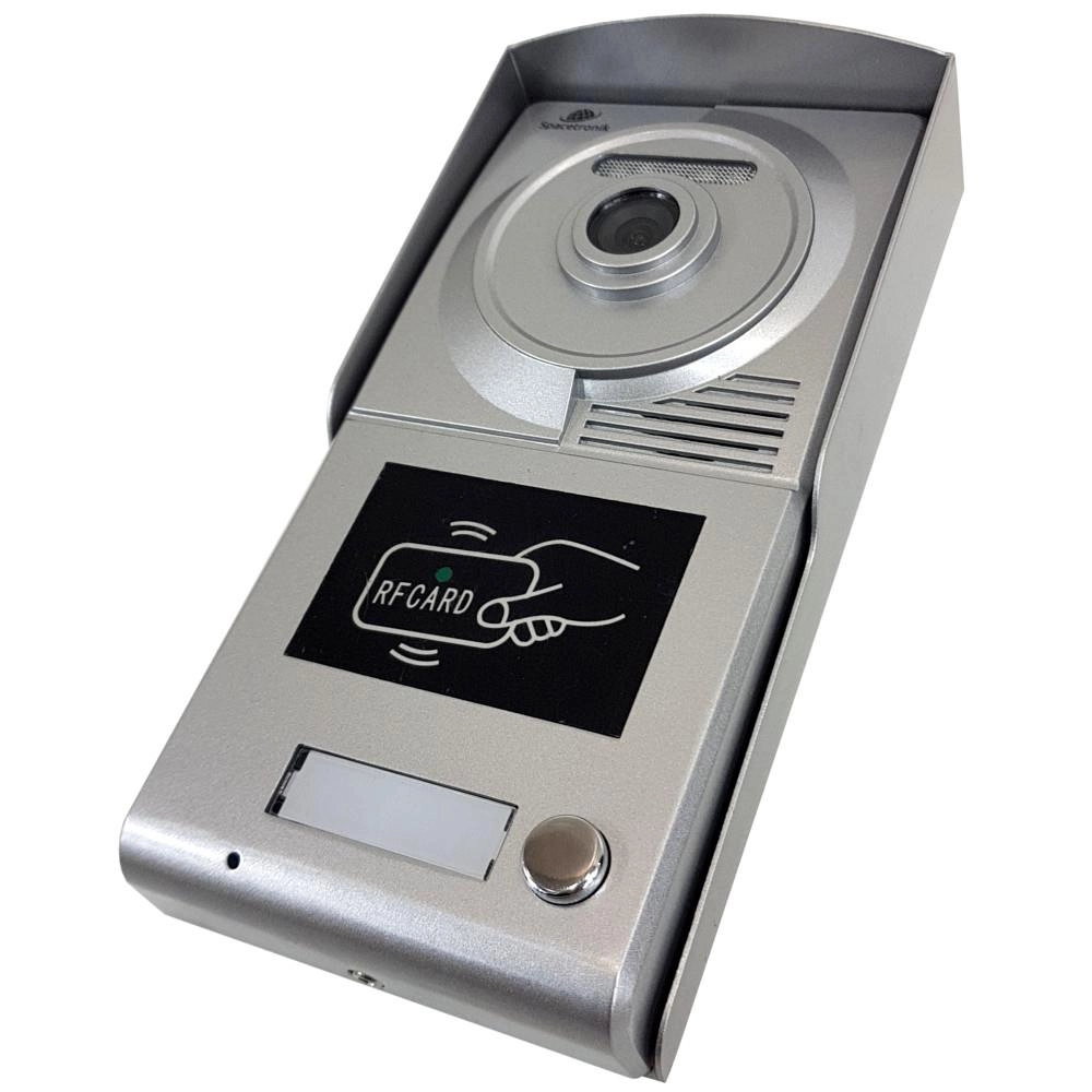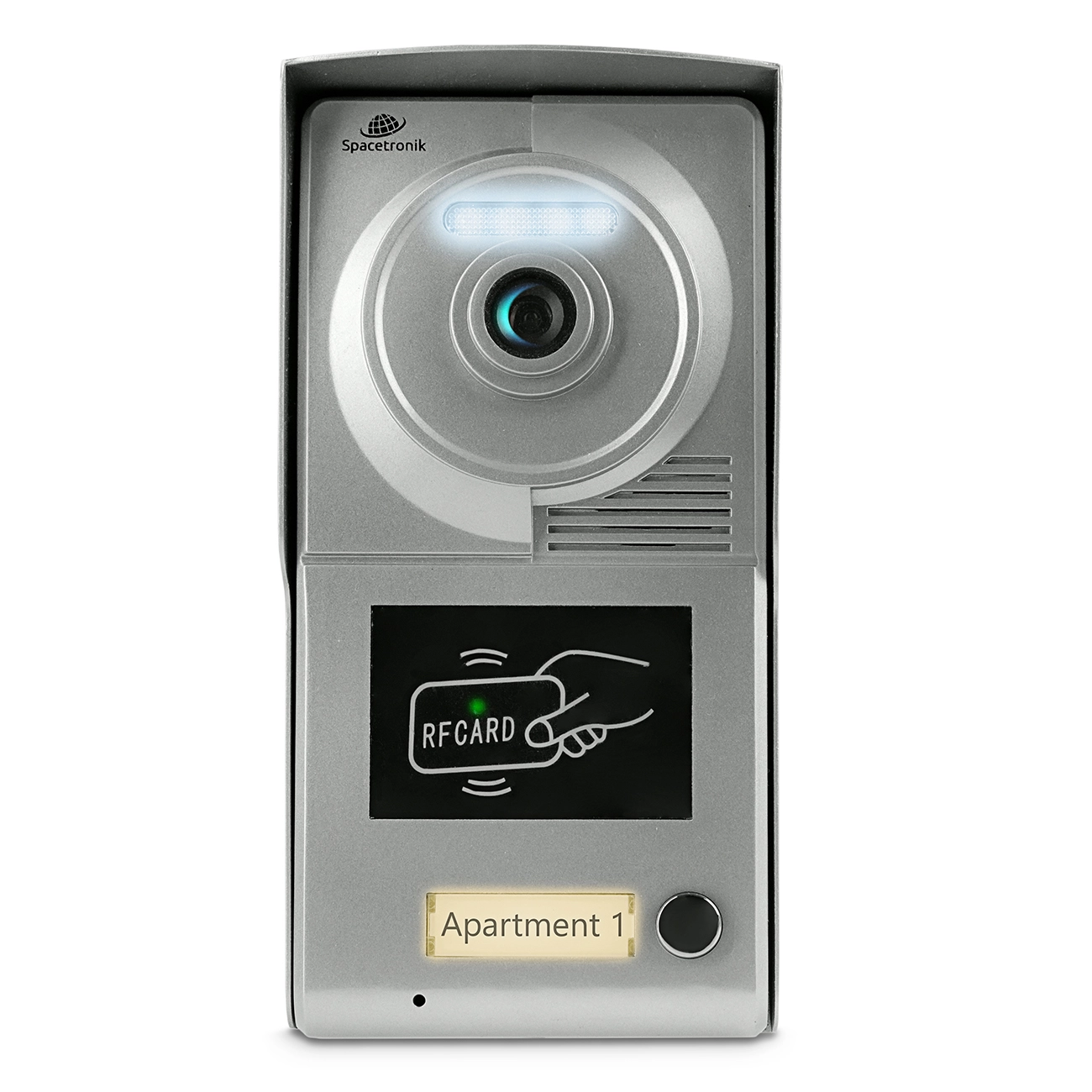 Video-Einzelsprechanlage mit eingebautem RFiD-Leser, der das Öffnen des Eingangs mit einer Karte oder einem Schlüsselring ermöglicht. Die Sprechstelle zeichnet sich durch ein formschönes, vandalismusgeschütztes Gehäuse aus Aluminiumlegierung aus, in das der Proximity-Leser und die beleuchtete Anzeigetafel integriert sind. Zu jeder Video-Türsprechanlage können weitere Schlüsselanhänger oder Karten hinzugefügt werden, was mit der mitgelieferten Masterkarte geschieht. Die LED-Nachtbeleuchtung ermöglicht eine komfortable Nutzung des Gerätes bei schlechten Sichtverhältnissen. Zum zseat gehört ein Monitor, der für die Verwendung mit dem Spacetronik DiO-Zweidraht-Video-Türsprechsystem konzipiert ist. Ausgestattet mit einem 4.3" TFT verfügt der Monitor über alle notwendigen Funktionen, die Geräte der Spitzenklasse auszeichnen. Das Produkt eignet sich gut für Einfamilienhäuser und kleine Unternehmen.