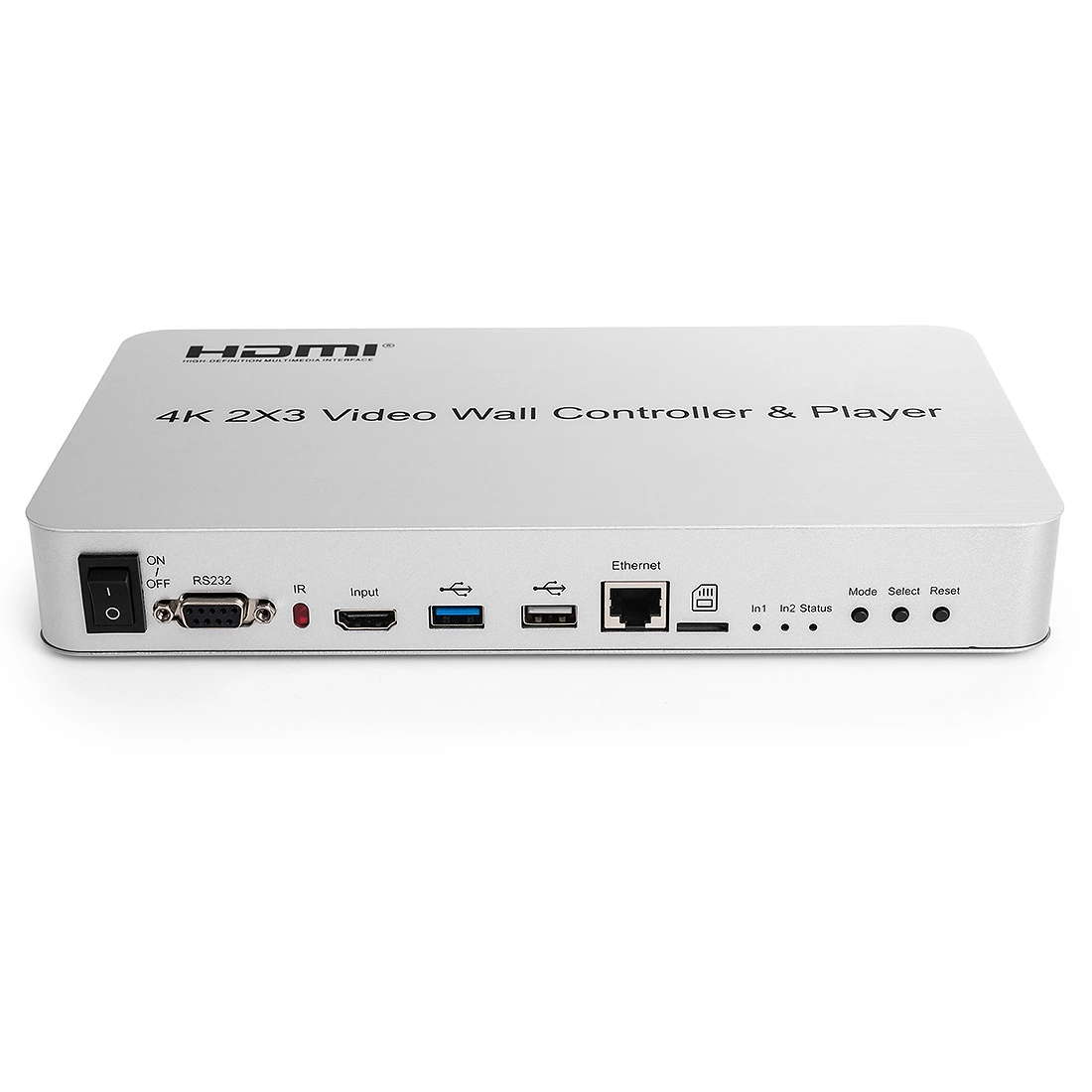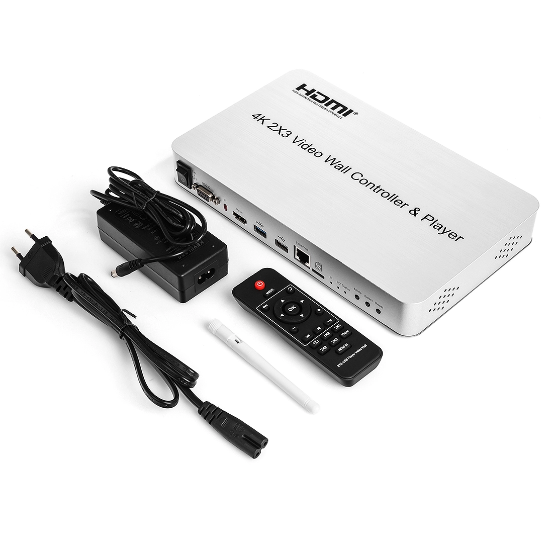Ein 2x3-Wandcontroller, der die Übertragung von Videos über den HDMI-Anschluss und die Anzeige auf HDMI-Empfängern in verschiedenen Konfigurationen ermöglicht. Sie können damit ein großes und dynamisches Bild erzeugen, indem Sie eine Wand aus 6 Empfängern aufbauen. Das Gerät unterstützt Kabel mit einer Länge von bis zu 5 m und einer Auflösung von 4K@30Hz.