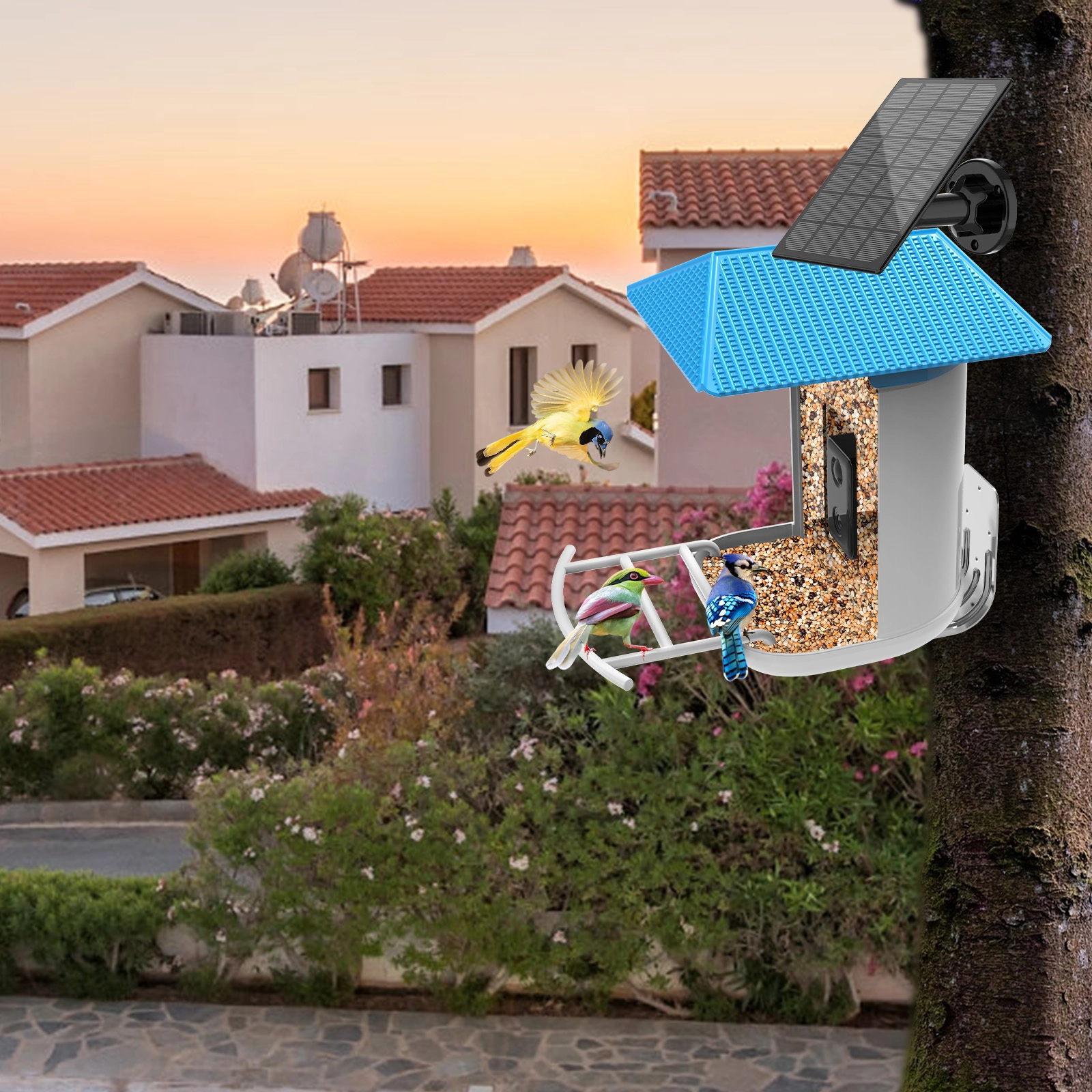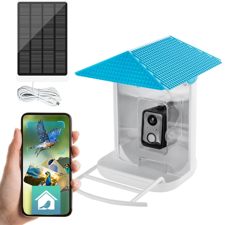 • Intelligentes Vogelfutterhaus mit Kamera und Solarpanel. Beobachten und erkennen Sie verschiedene Vogelarten. Steuerung mit der kostenlosen Smartphone-App Bird Lover/Bird Lover Feeder. Machen Sie Fotos und nehmen Sie Videos auf.
