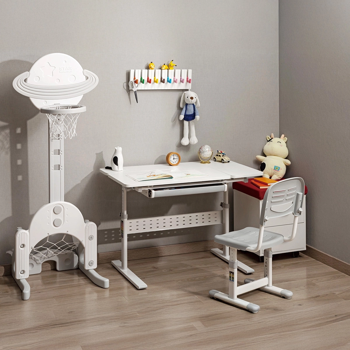 Der verstellbare Kinderschreibtisch ist mit vielen Funktionen ausgestattet, die zu Komfort und Sicherheit beitragen.