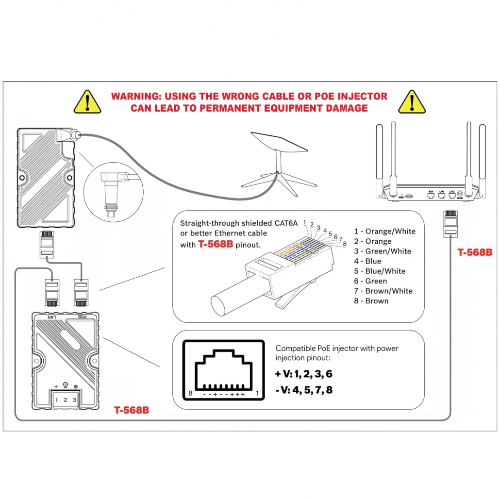 Urządzenie to pozwala na przekonwertowanie sygnału z anteny Starlink na RJ45. Pozwala to stworzyć kompatybilność między urządzeniami posiadającymi różne typy wejść, np. antenę z routerem.
