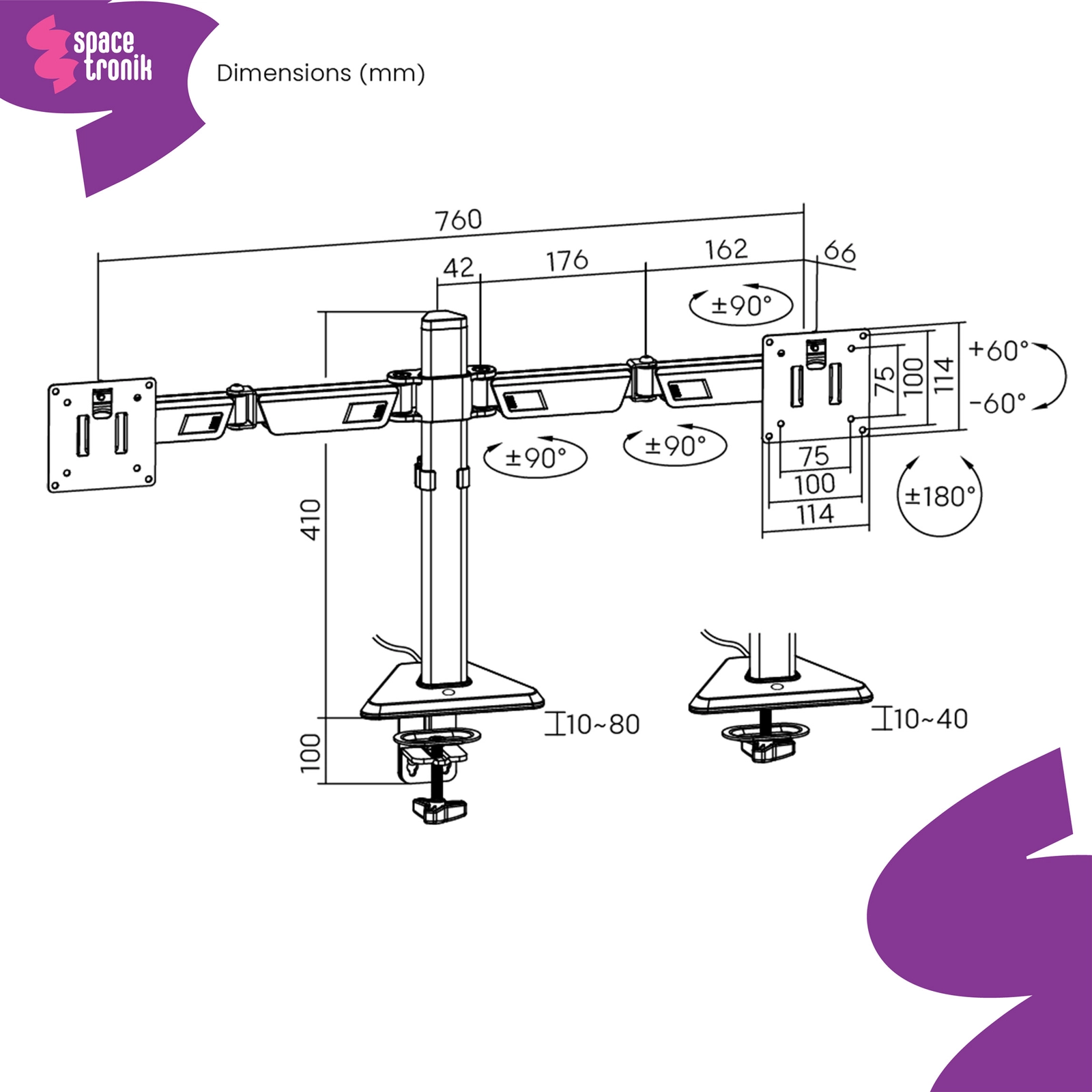 • Uchwyt do monitora Spacetronik SPAA120L. Powieś na nim monitory do 32" i 12 kg każdy. Dopasuj kąt nachylenia, obrotu i wysokość. Kompatybilny z systemem VESA, wyposażony w światło RGB. Kolor ametystowy.