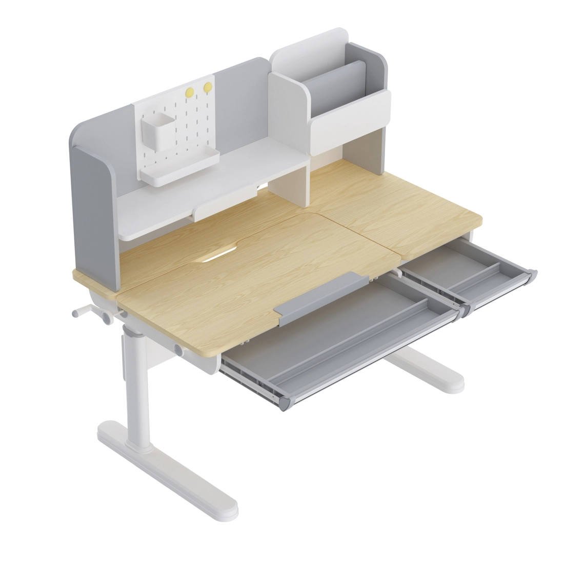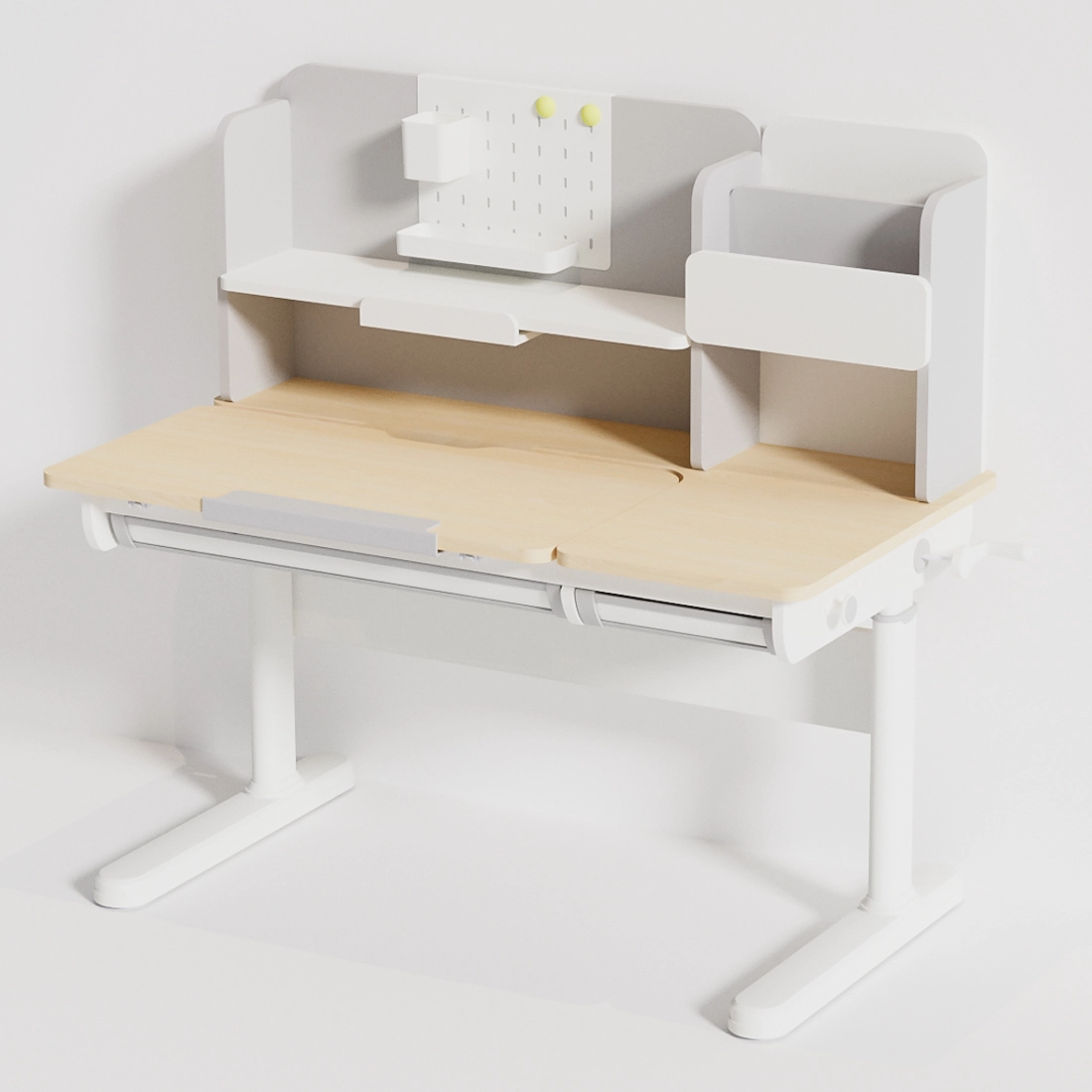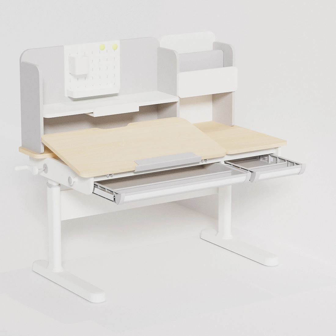 Funkcjonalne biurko dziecięce z nadstawką, regulacją wysokości i pochylanym blatem. Wyposażone w szuflady, tablicę perforowaną i praktyczne półki, które pomagają utrzymać porządek w strefie nauki i zabawy. Idealne do pokoju ucznia, rośnie razem z dzieckiem!