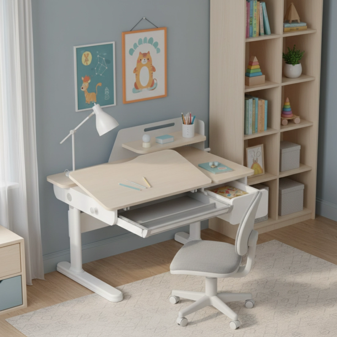 Dużym plusem jest pochylany blat, który ułatwia czytanie, pisanie i rysowanie. Odpowiedni kąt pracy pomaga ograniczyć garbienie się, zmniejsza napięcie karku i sprawia, że dziecko może dłużej pracować w wygodnej pozycji.