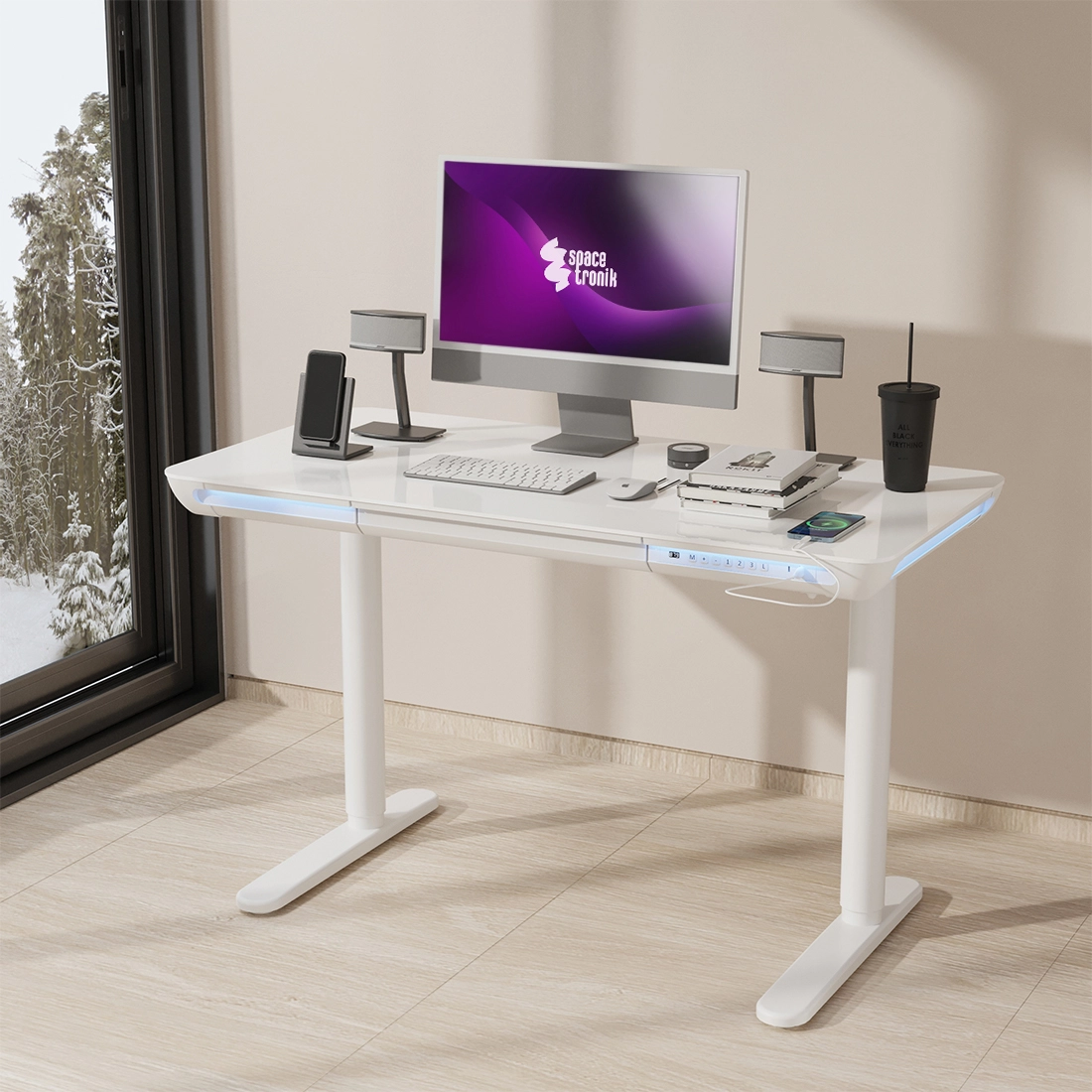 biurko elektryczne, biurko z regulacją wysokości, biurko spacetronik, biurko szklane, biurko białe, biurko z szufladą, biurko z portami usb, biurko led