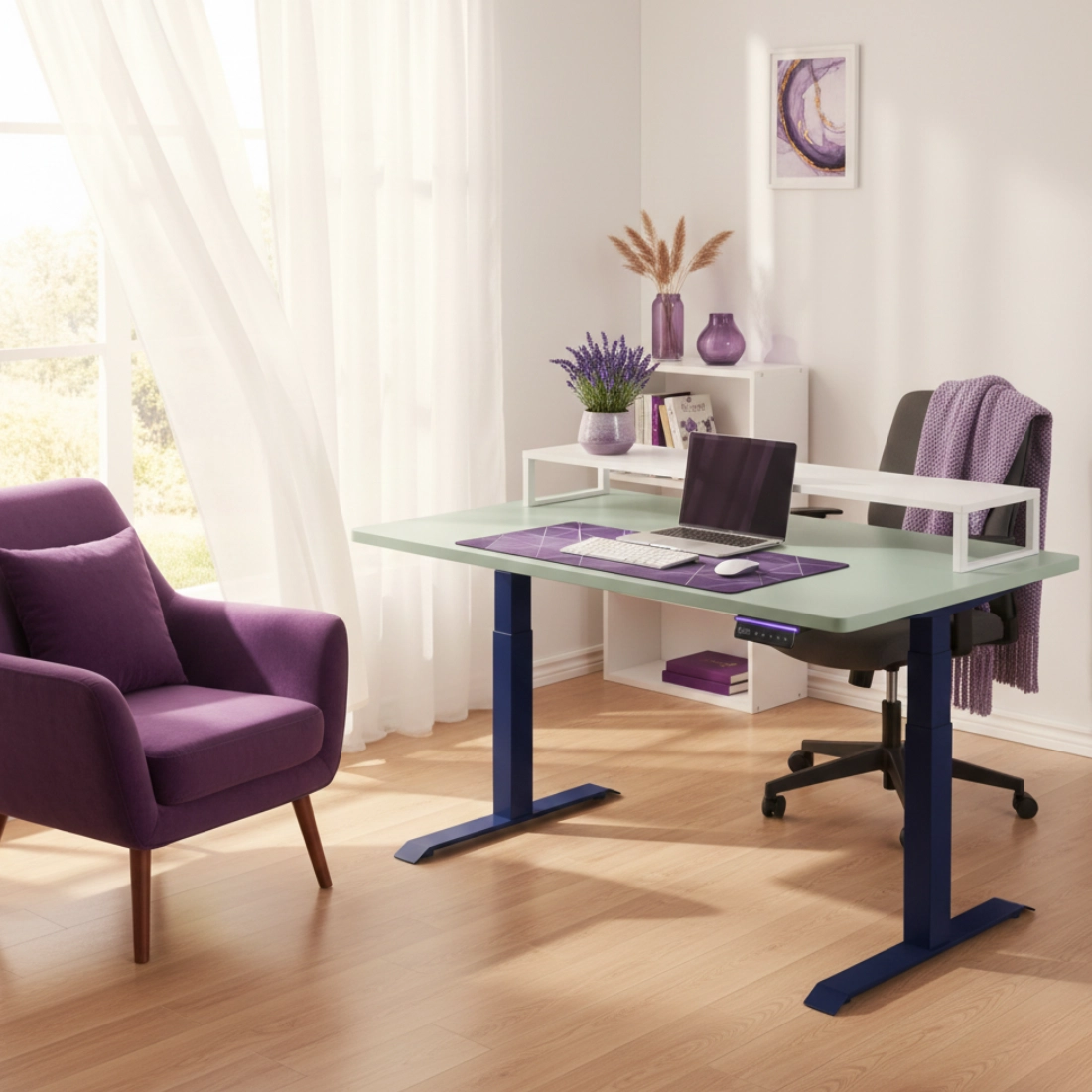 • Ergonomiczne biurko do pracy siedzącej i stojącej: dwusilnikowy stelaż z kontrolerem OLED RGB, pamięcią ustawień i systemem antykolizyjnym oraz blat MDF premium malowany proszkowo – trwały, higieniczny i łatwy w czyszczeniu.