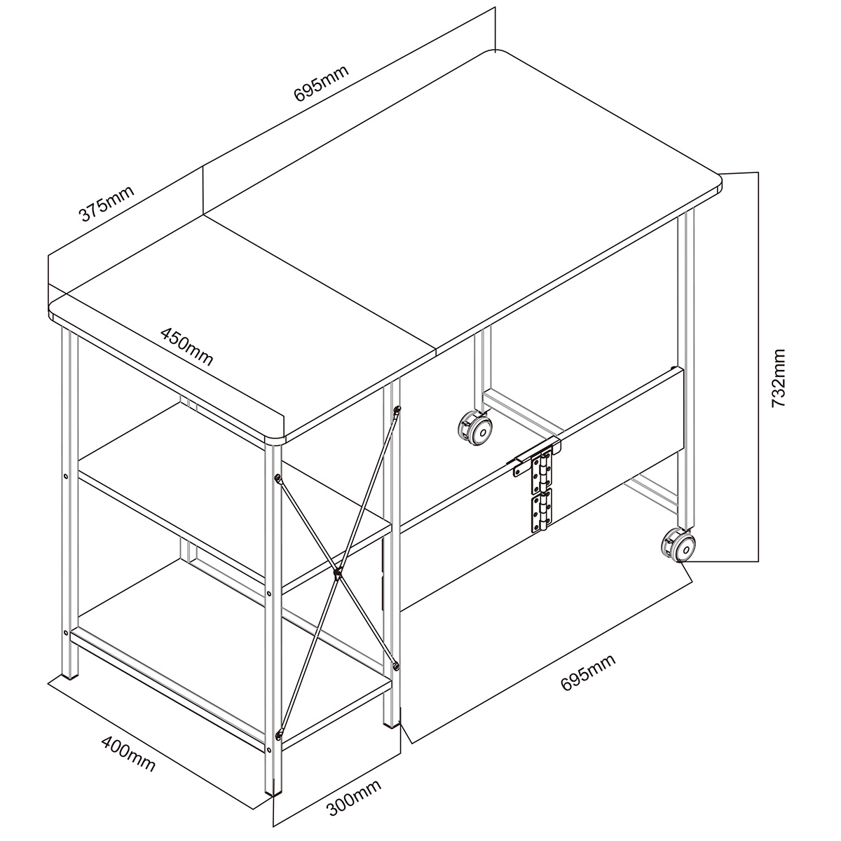 - Duży blat - Blat złożony z dwóch części 37.5×45 cm i 69.5×45 cm. Łączne wymiary blatu 107×45 cm.