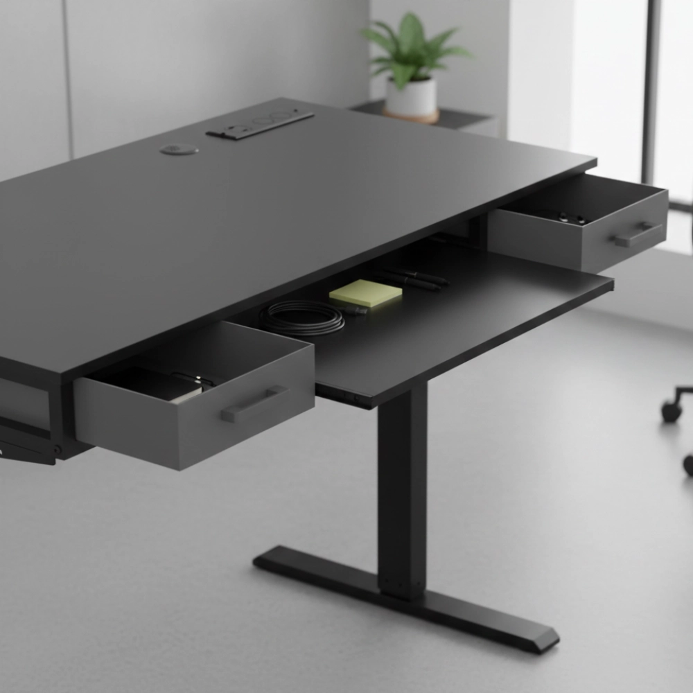 Wbudowana szuflada pod blatem pomaga uporządkować przestrzeń roboczą: schowasz w niej dokumenty, długopisy, notatniki czy dysk zewnętrzny. System soft-close sprawia, że domykanie jest płynne i ciche — bez trzaskania i bez irytujących dźwięków.
