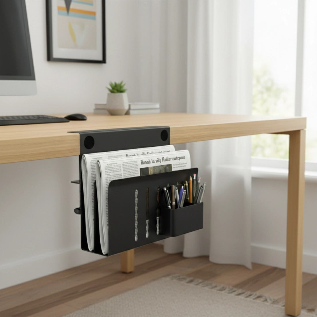 Wymiary 30 × 30 × 12 cm pozwalają zyskać dodatkowe miejsce dokładnie tam, gdzie jest najbardziej potrzebne – przy krawędzi blatu. Organizer nie zajmuje powierzchni roboczej, a jednocześnie pomaga utrzymać rzeczy w zasięgu ręki i uporządkować strefę pracy.