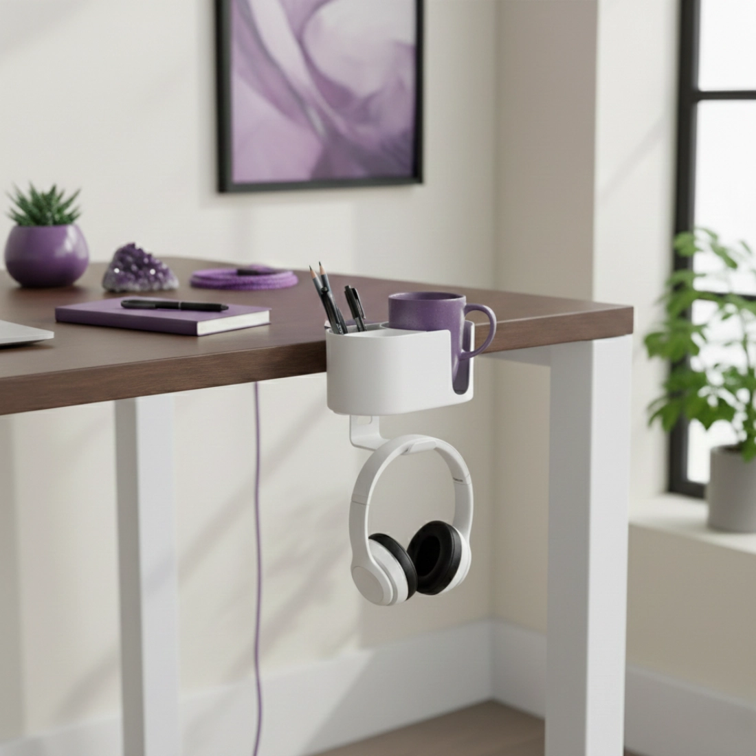 Niewielki organizer nie zajmuje przestrzeni roboczej, a realnie poprawia wygodę. Uchwyt na kubek i haczyki na słuchawki porządkują najczęściej używane akcesoria i pomagają utrzymać estetyczne, schludne stanowisko.