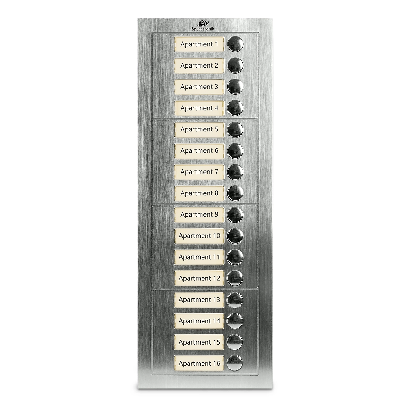 Dodatkowy panel szesnastorodzinny do rozbudowy systemu Spacetronik DiO. Panel wyróżnia się estetycznie wykonaną wandaloodporną obudową ze stopu aluminium, w którą wkomponowane zostały podświetlane szyldy. Podświetlenie nocne LED pozwala na komfortowe korzystanie z urządzenia w warunkach niedostatecznej widoczności.