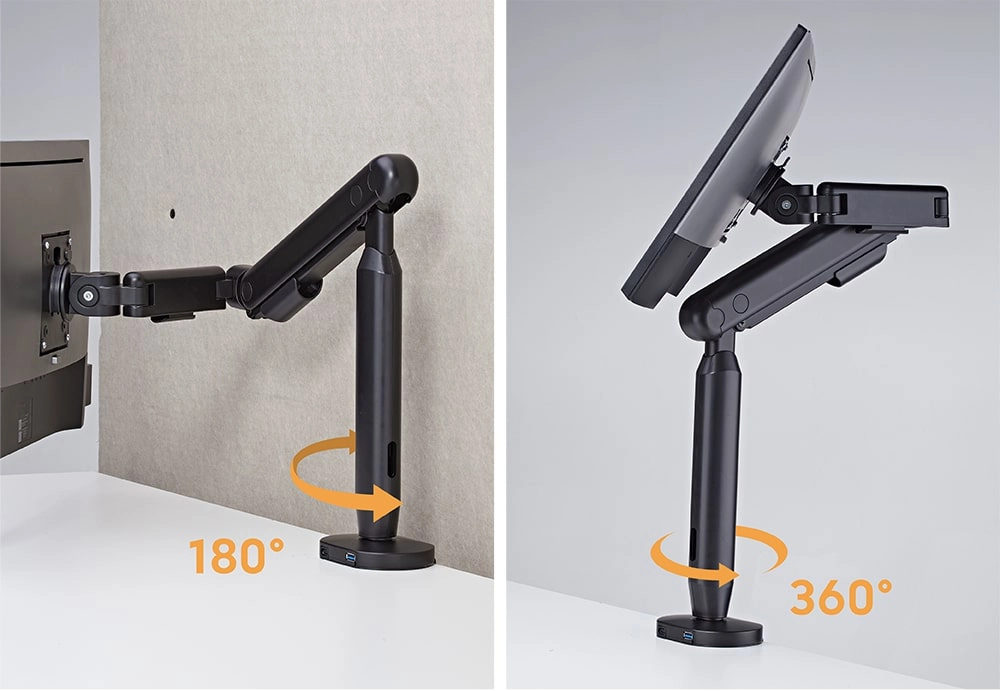 Uchwyt do monitora Spacetronik SPAI110 dopasuje się idealnie do Twoich potrzeb. To wszystko z uwagi na szerokie możliwości regulacyjne. Ramię do monitora daje Ci opcję pochyłu w zakresie +60°~-60° i obrotu +90°~-90°i obrotu ekranu +90°~-90°. Blokada obrotu o 180° zapobiega wsuwaniu się ramienia monitora w ścianę. Dzięki temu z łatwością ustawisz monitor, tak jak chcesz. Maksymalny udźwig uchwytu to 11 kg.