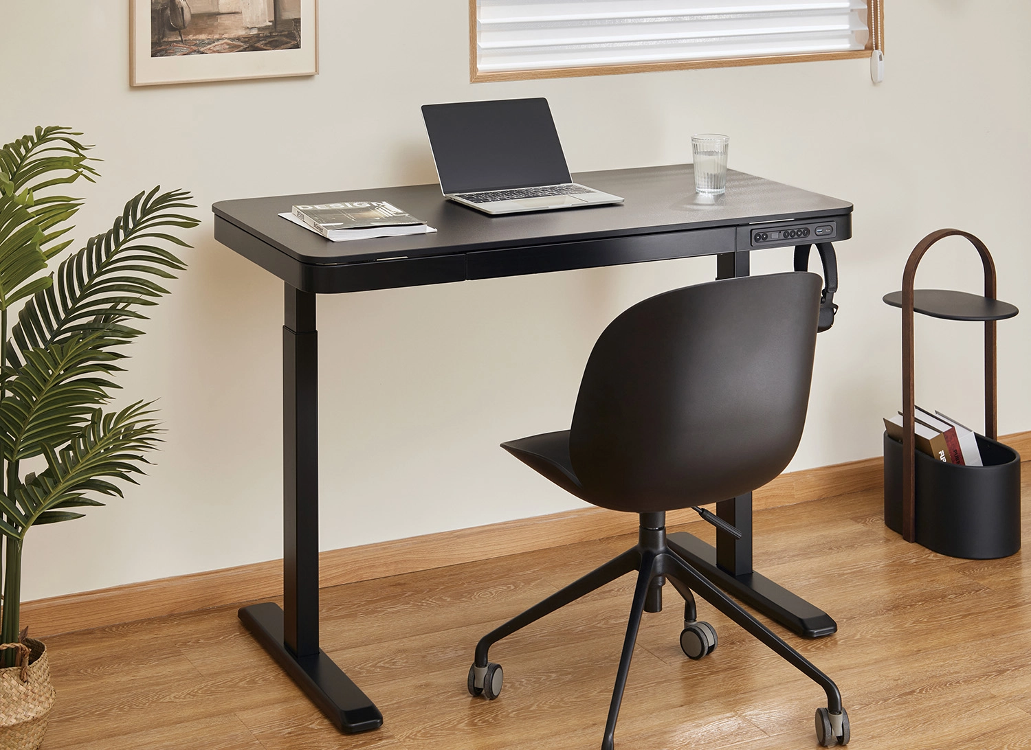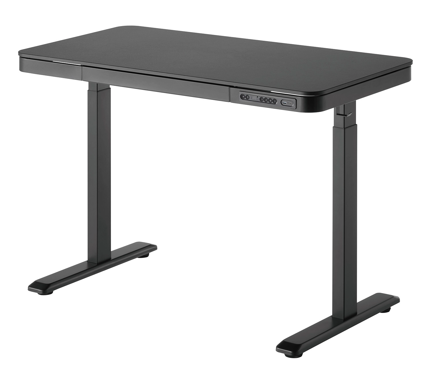 • Regulowane biurko z podnoszonym blatem w zakresie od 72 do 120 cm, które pozwoli Ci pracować na stojąco lub siedząco. Czarny blat 118 x 60 cm, czarny stelaż. Posiada szufladę i ładowarkę USB-A, USB-C i inne udogodnienia.