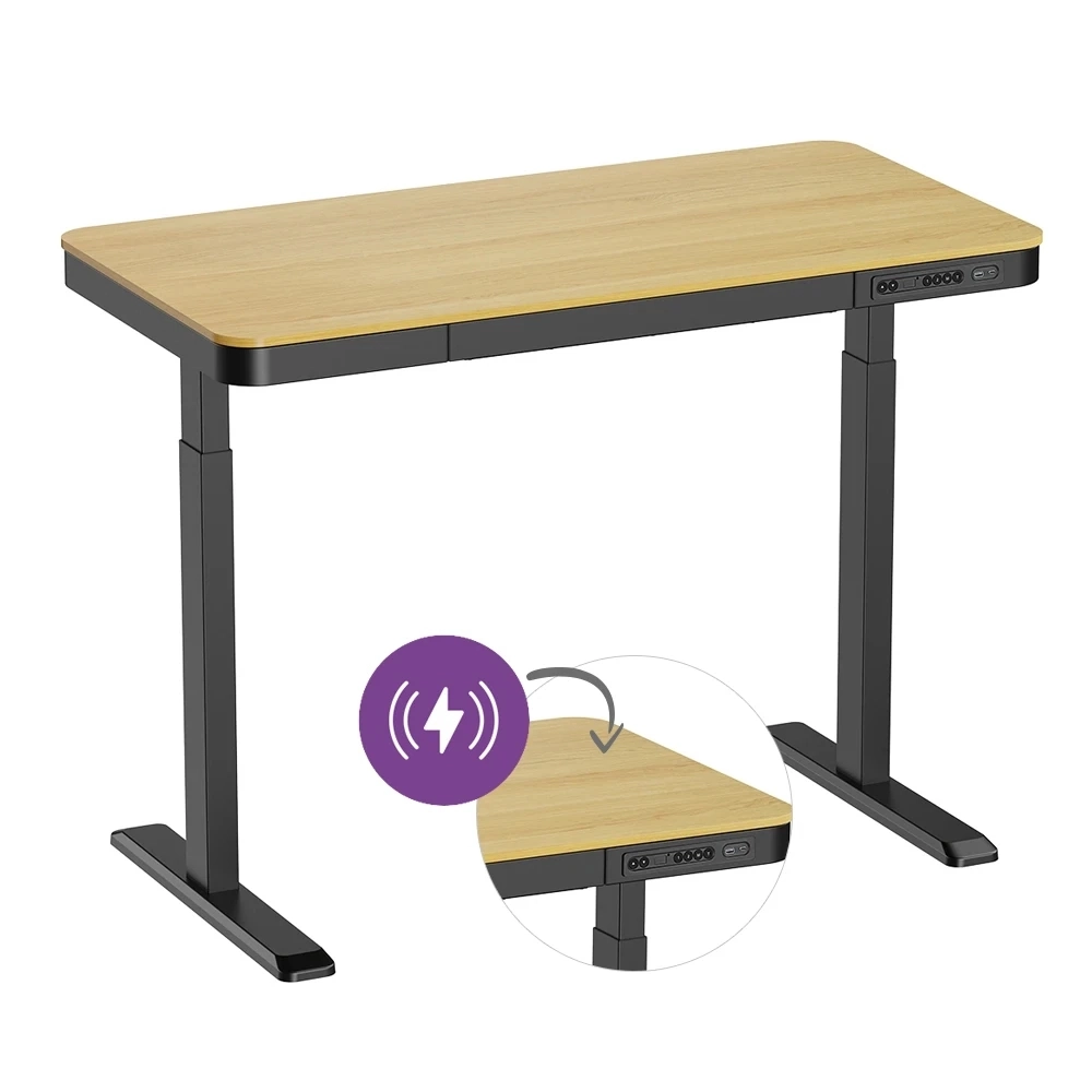 • Biurko z regulacją wysokości elektryczne w zakresie od 72 do 120 cm, które pozwoli Ci pracować na stojąco lub siedząco. Drewno 118 x 60 cm, Czarny stelaż. Posiada szufladę i ładowarkę USB-A, USB-C, indukcyjną (w blacie).