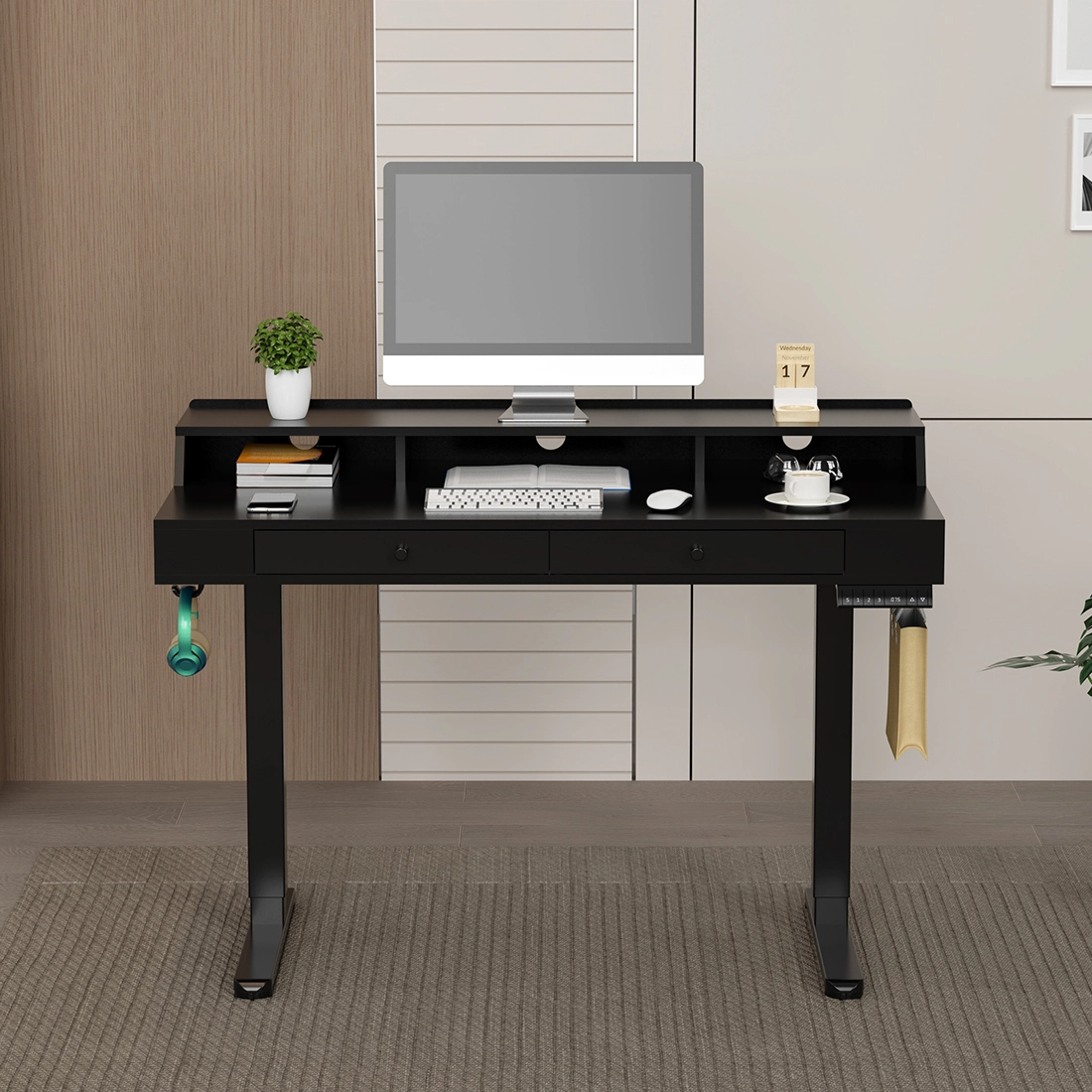 Jeśli cenisz sobie przestrzeń i porządek, pokochasz podwójny blat w tym biurku. Górna i dolna powierzchnia zwiększają funkcjonalność, zapewniając miejsce na monitor, laptop, dokumenty i akcesoria. Dzięki temu każdy element Twojej pracy znajduje swoje miejsce, a Ty zyskujesz czystą, zorganizowaną przestrzeń sprzyjającą skupieniu i kreatywności. To więcej niż blat – to Twoja baza do działania.