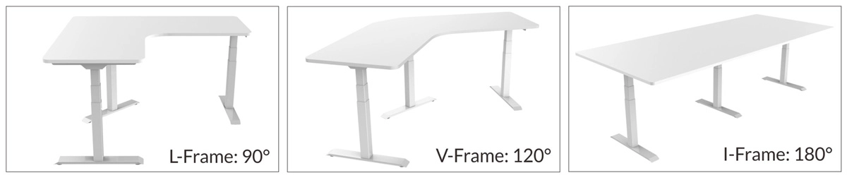 Wszechstronna rama elektrycznego stelaża oprócz regulacji góra/dół oraz przekształcenia do trzech wariantów, pozwala na podwójną ręczną regulację horyzontalną (w bok). W łatwy sposób rozszerzysz konstrukcję pod wymiar swojego blatu. Sugerowane wymiary blatu: dla 90° 1300 - 1900 mm (2 strony), 600 - 800 mm; dla 120° 1100 - 1800 mm, 600 - 800 mm; dla 180° 1700 - 2900 mm, 600 - 1000 mm.