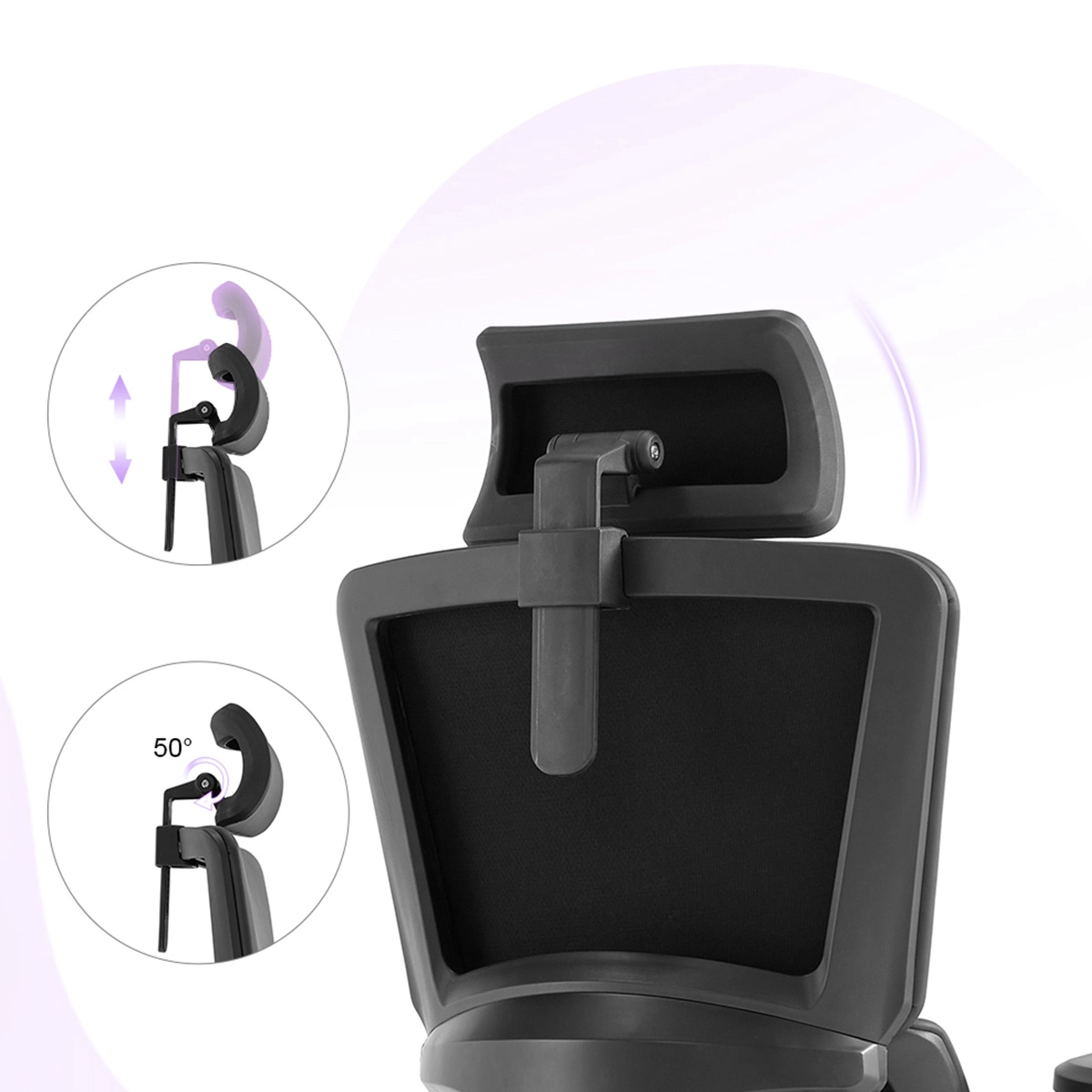 Model SPC-EGAN został wyposażony w zagłówek z dwukierunkową regulacją, umożliwiającą dopasowanie do sylwetki oraz preferowanej pozycji siedzącej. Zakres regulacji obejmuje wysokość (góra–dół) oraz kąt nachylenia (przód–tył). Dzięki temu możliwe jest ustawienie zagłówka w sposób zapewniający właściwe podparcie dla odcinka szyjnego kręgosłupa. Funkcja ta pozwala zredukować napięcia w obrębie karku i szyi, poprawiając komfort użytkowania zarówno podczas pracy, jak i chwil relaksu z odchylonym oparciem.