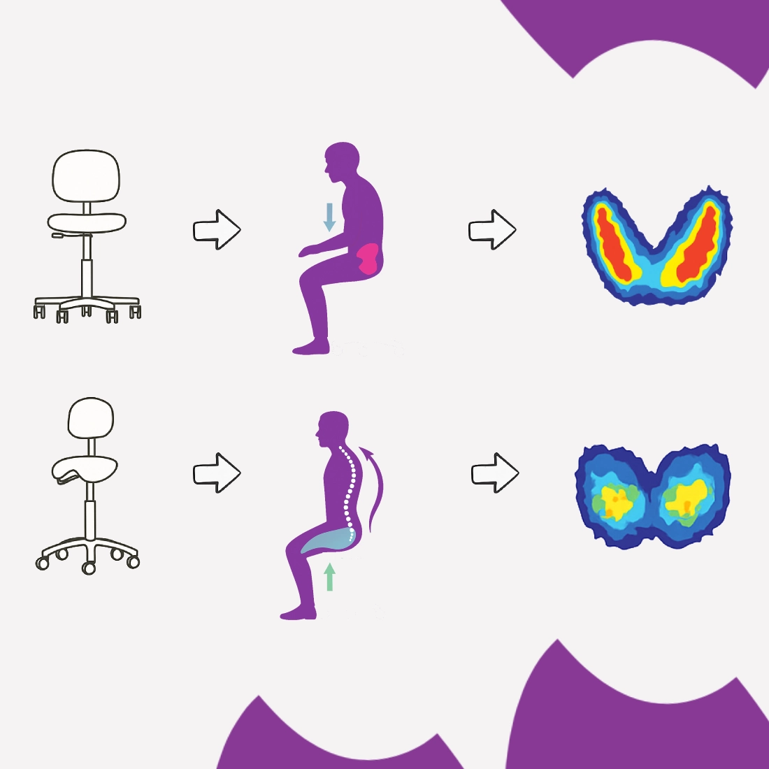 Siedzisko siodłowe wspiera tzw. pozycję aktywną, półsiedzącą - czyli taką, w jakiej nasze ciało samo się układa, kiedy nie działa na nie grawitacja. Tę „pozycję zerową” zaobserwowano u astronautów w stanie nieważkości oraz u ludzi unoszących się swobodnie w wodzie. To właśnie ta „domyślna” pozycja ciała jest najbardziej naturalna i najmniej obciążająca dla kręgosłupa. Kiedy siedzisz, od ułożenia miednicy zależy, co zrobi kręgosłup. Jeśli miednica się zapada (czyli pochyla do tyłu), plecy automatycznie się zaokrąglają, barki opadają, a głowa pochyla się do przodu, przez co plecy sie garbią.
