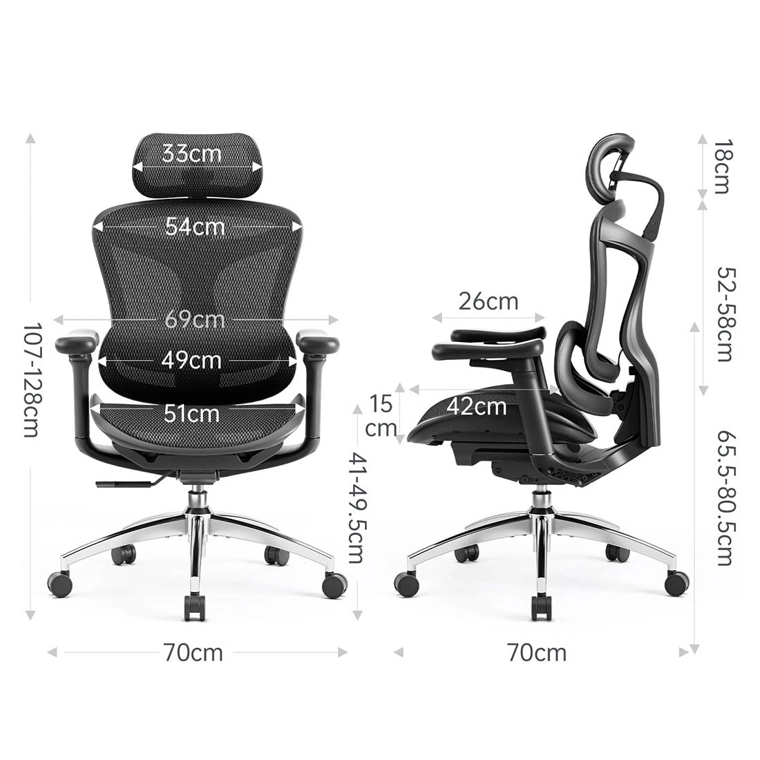 Krzesła i fotele do biura potrafią znacząco się od siebie różnić. Mimo że z wyglądu są podobne, ich funkcjonalność może być odrobinę inna. Za pomocą jednej dźwigni znajdującej się pod siedzeniem jesteś w stanie regulować zarówno wysokość, jak i pochył fotela biurowego. Jesteś w stanie bardzo szybko i prosto dopasować krzesło do swoich potrzeb, bez potrzeby wstawania z niego. Jego wysokość możesz regulować w zakresie 107 - 128 cm. Natomiast pochył odbywa się w zakresie 92° - 112°.