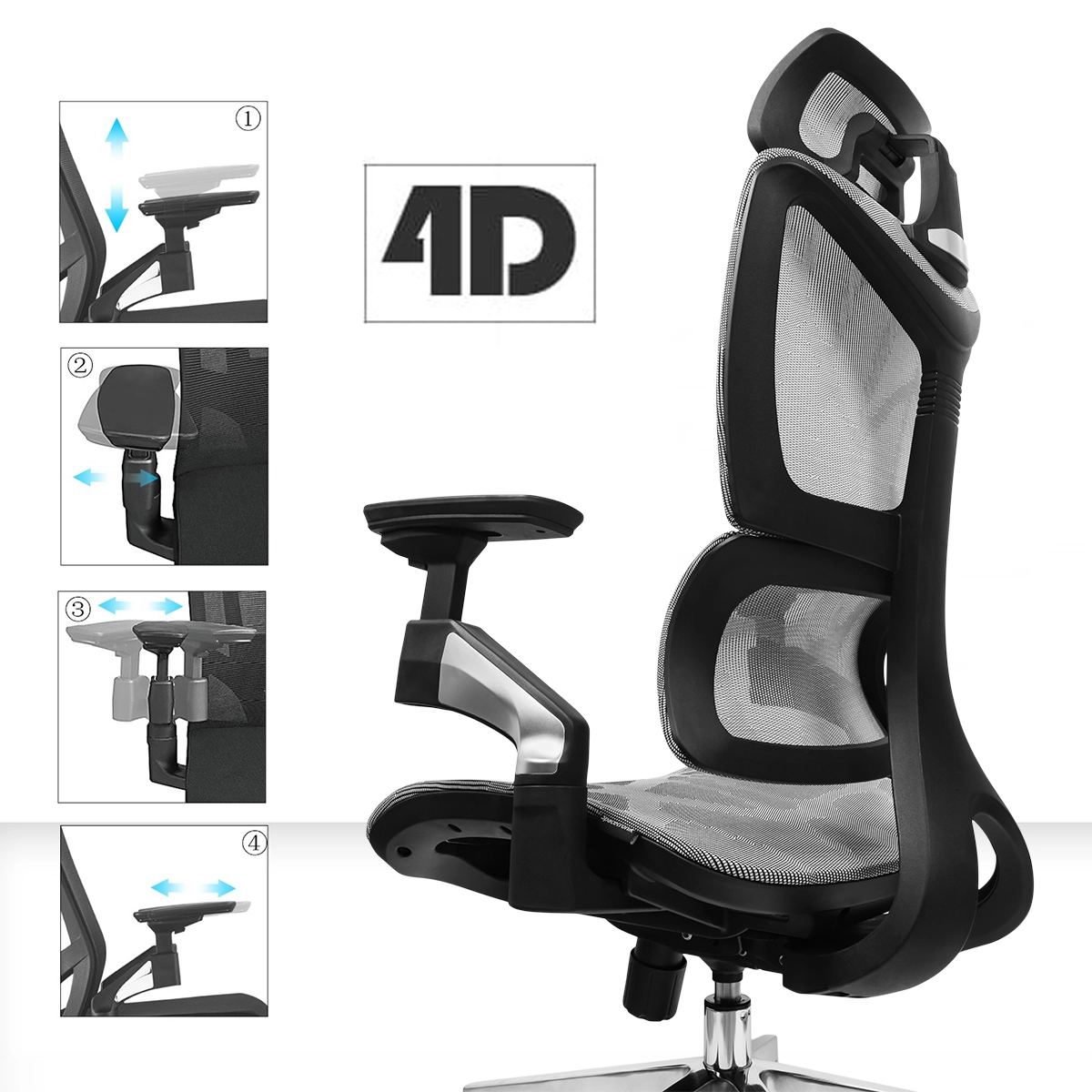 • Regulacja podłokietnika 4D (wysokość, przód & tył, obrotowa podstawa podłokietnika w zakresie około 60 st., lewo & prawo górna podpórka)